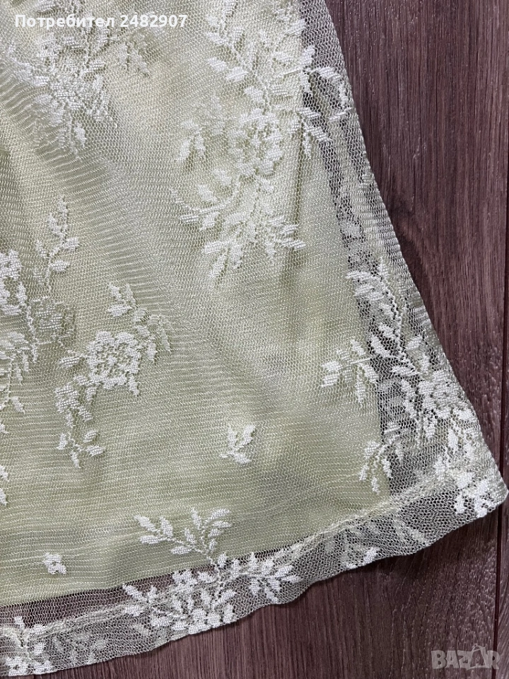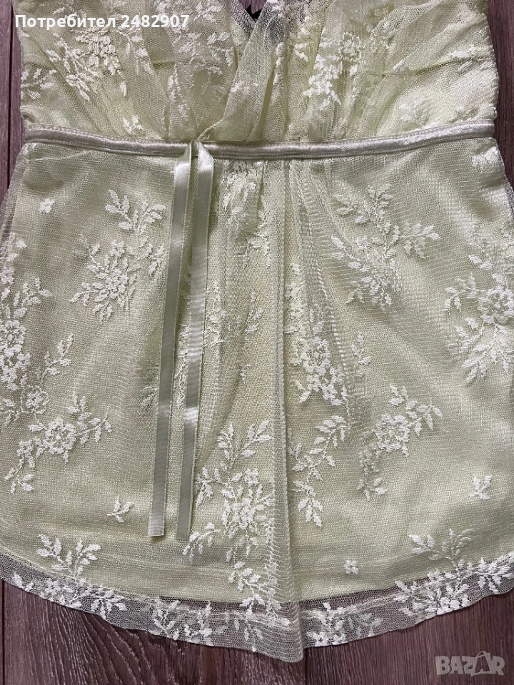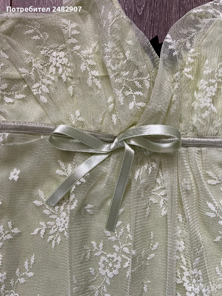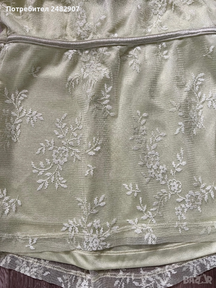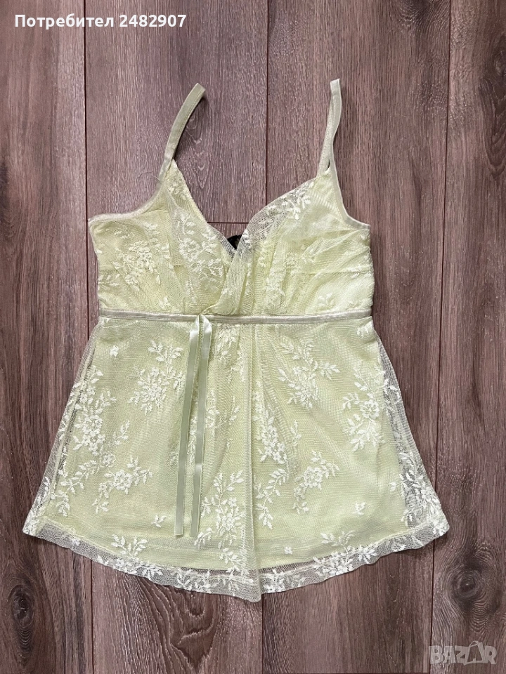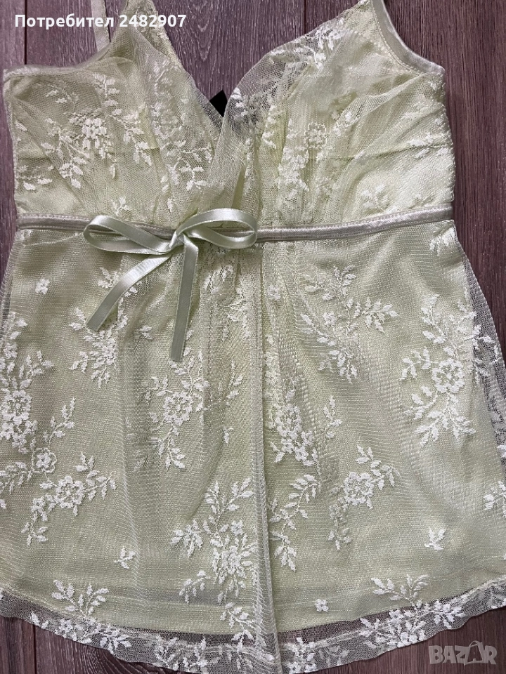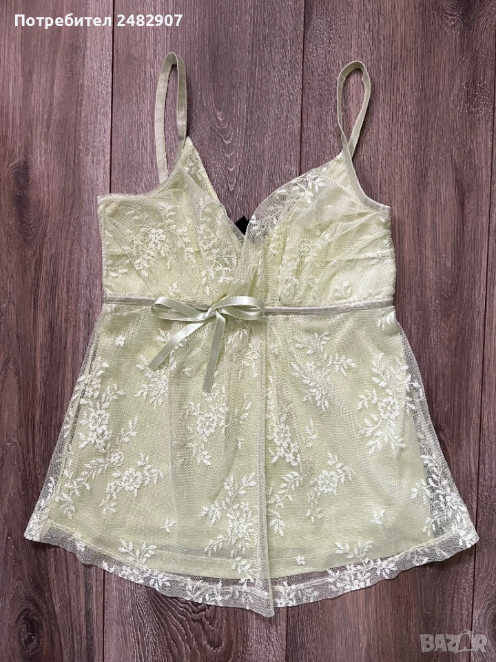 Ефектен дамски потник, цвят резеда с подплата и дантела, размер XS. Съдържа 100 % полиестер. Ширина в раменете - 18 см, ширина под мишниците -31 см, ширина в долната част - 49 см, дължина от горната част на презрамките до долу -55 см. Много запазен, почти не е използван.
