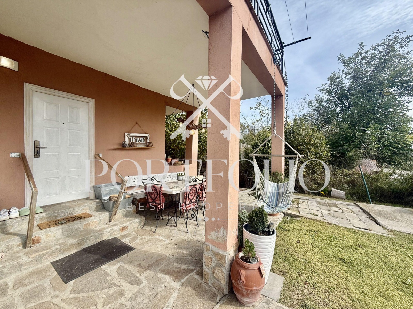 Пред самата къща има веранда с навес, а до вторият и етаж от който има голяма панорамна тераса се стига посредством външно стълбище.