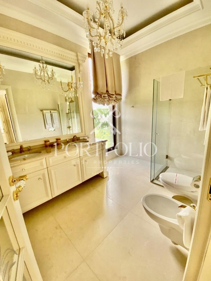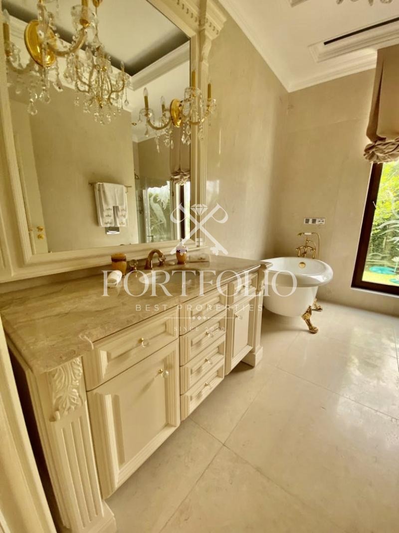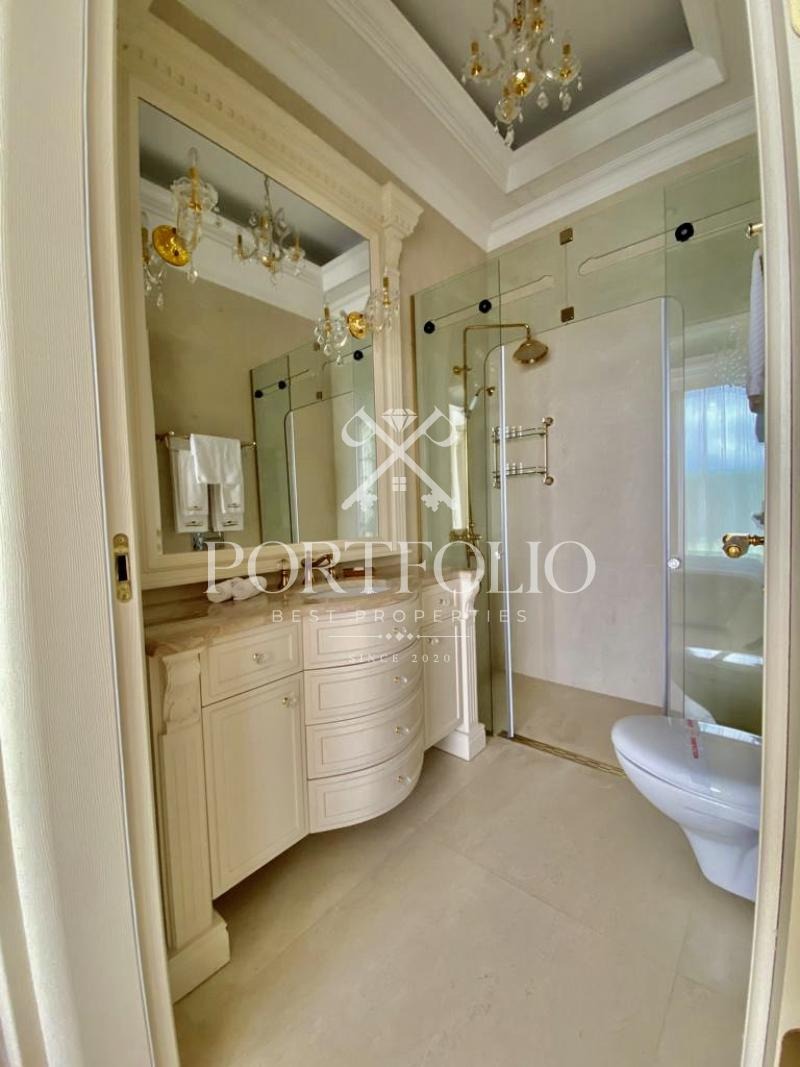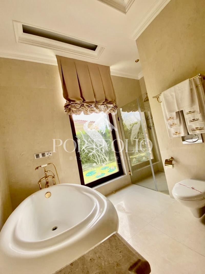 С внушителен вход къщата ви посреща в изключително просторен хол. Пространството на дневната и кухнята е решено в open space схема. Дневната е с обособени кътове за трапезария, почивка и забавление с голяма камина. На юг дневната се отваря изцяло към верандата през голяма витрина, като се образува уникално преходно пространство идеално за вечерни партита. Разполага с четири двойни спални със самостоятелни бани и дрешник. Дневната и две от спалните са обърнати към вътрешната градина на къщата и басейна. В градината централно е разположен голям плувен басейн изцяло облицован с естествен мрамор Pyrgos Light . Градината е просторна и богато озеленена с екзотични дървета и цветя с обособени кътове за шезлонги около басейна. Къщата е луксозно и много елегантно обзаведена, декорирана с авторски витражи с изцяло индивидуално изработени мебели. В интериора са използвани изключително луксозни естествени материали, естествен мрамор Pyrgos Light .