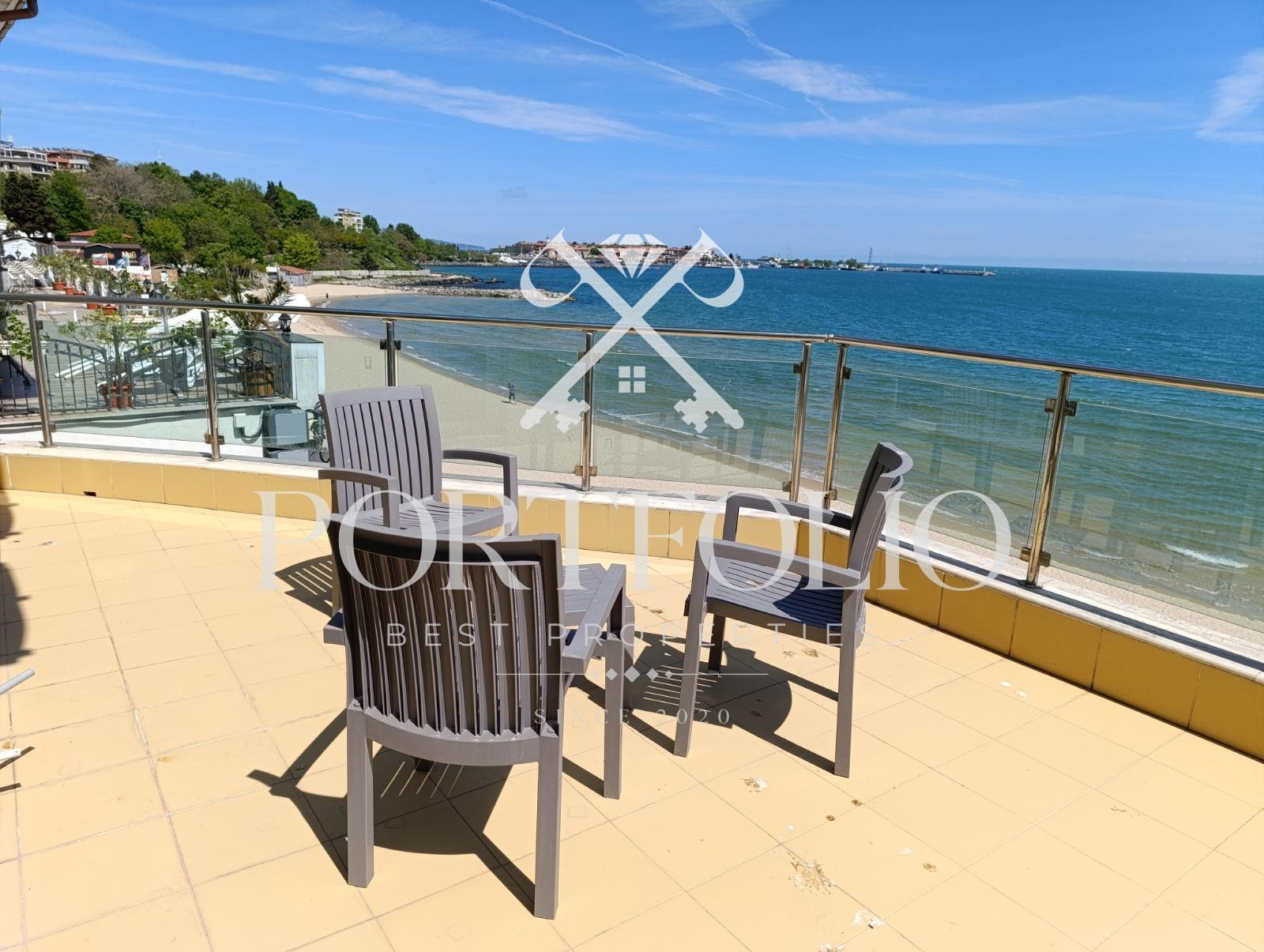 предлага в продажба тристаен луксозен апартамент с директна гледка море, с мебели и обзавеждане в комплекс разположен на първа морска линия пред южен плаж гр.Несебър!