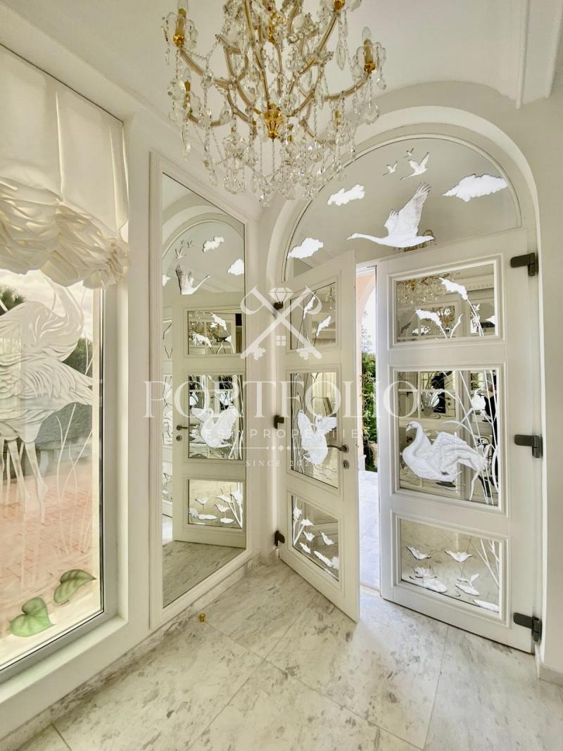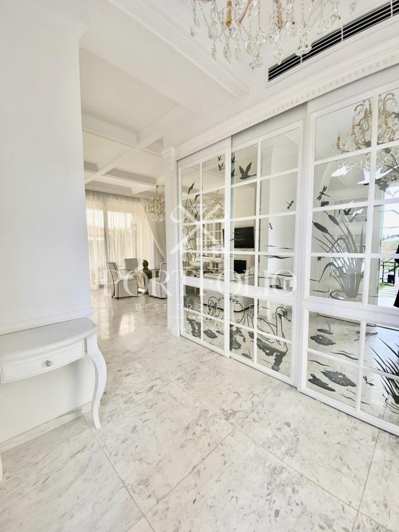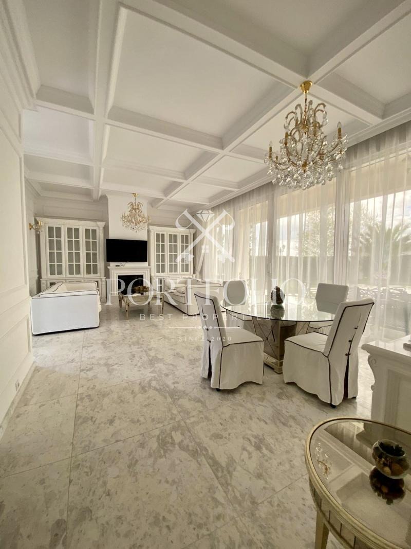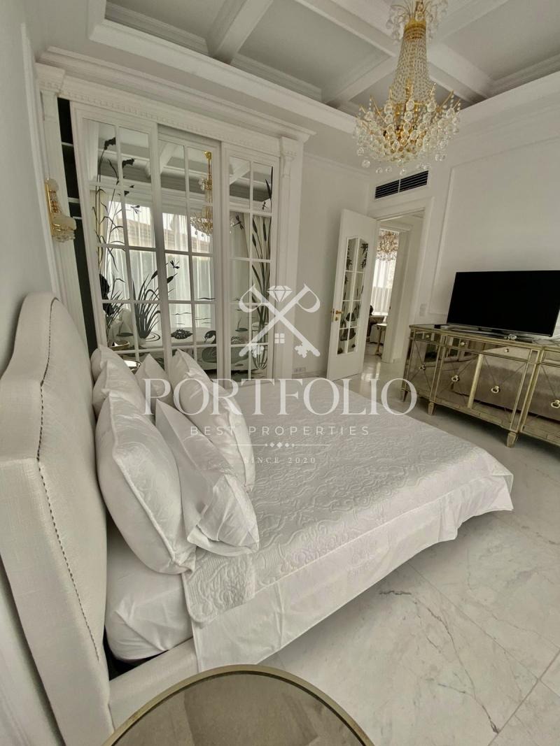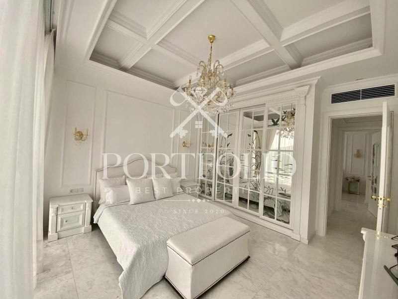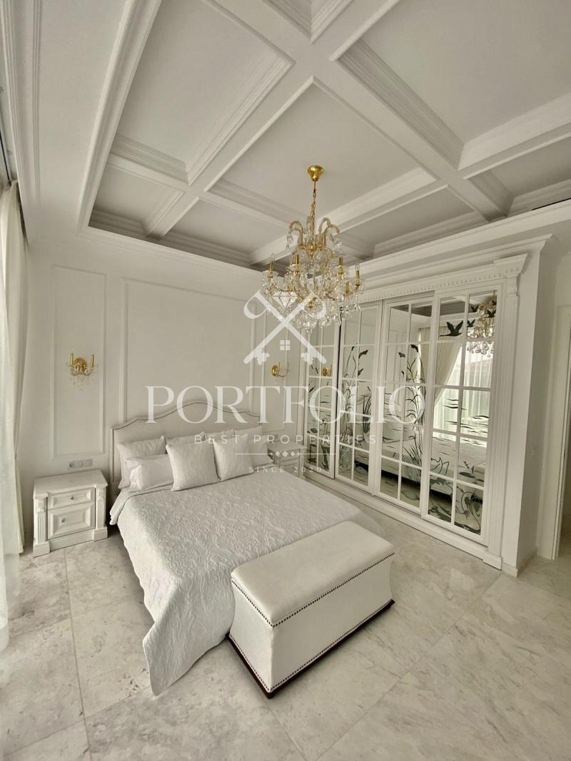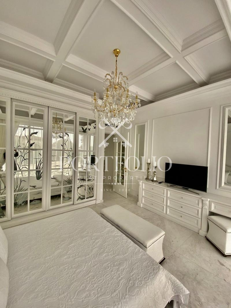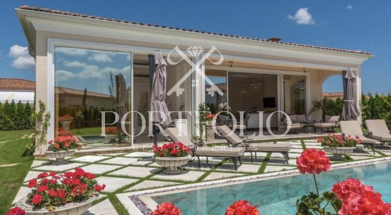 Къщата, която предлагаме в продажба е с обща площ от 160кв.м. разполага с двор от 862кв.м. и басей в него от 42кв.м.От представителният вход къщата ви посреща в просторна дневна. Пространството на дневната и кухнята е решено в open space схема с обособени кътове за трапезария, почивка, забавление и камина. На юг дневната се отваря към верандата през широки витрини. Верандата е покрита, което я прави уютно място за почивка. Къщата разполага с две двойни спални с обща баня. Къщата е обзаведена изключително елегантно с изцяло индивидуално изработени мебели. В интериора са използвани луксозни естествени материали, мрамор, дърво. Дневната и родителската спалня са обърнати към вътрешната градина на къщата и басейна. В градината централно е разположен басейн изцяло облицован с мрамор. Градината е богато озеленена с екзотични дървета и цветя с обособени кътове за шезлонги около басейна.