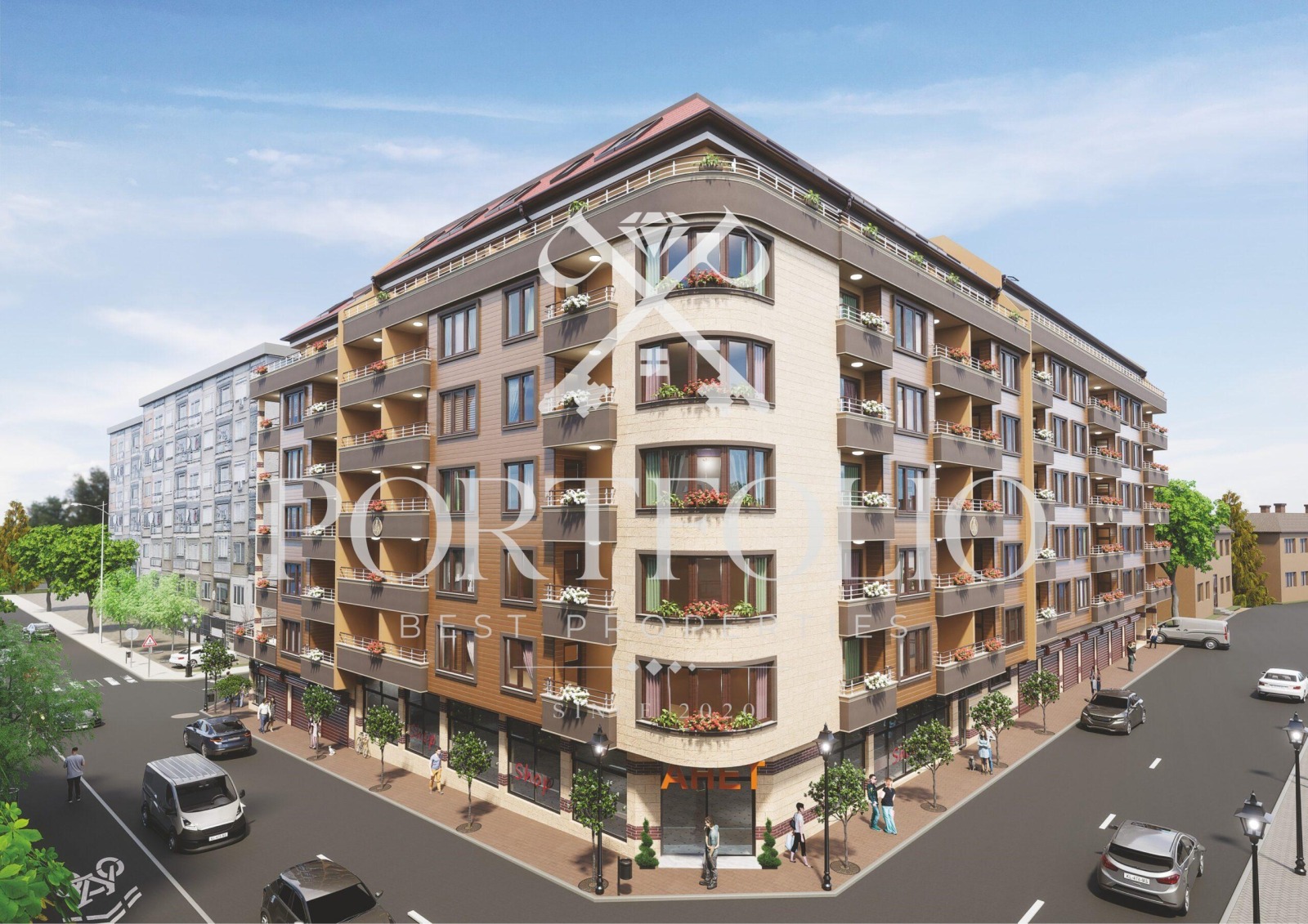 Сградата е с елегантна и модерна архитектура, състояща се от сутеренен етаж с паркоместа, гаражи и складове, партерен етаж с магазини и гаражи и 7 жилищни етажа. Сградата ще бъде изградена с изкючително висок клас материали. Дограмата е петкамерна PVC цвят \'златен дъб\', специална външна мазилка- водоотблъскваща и UV устойчива.Външната облицовка е с естествен камък Травертин на партерен етаж и комбинация от австрийска вентилируема обшивка Верзалит и минерална силиконова мазилка на останалите етажи
