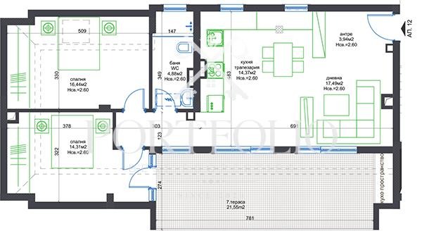 Апартаментът е с площ 124 кв.м. и добро планиране.