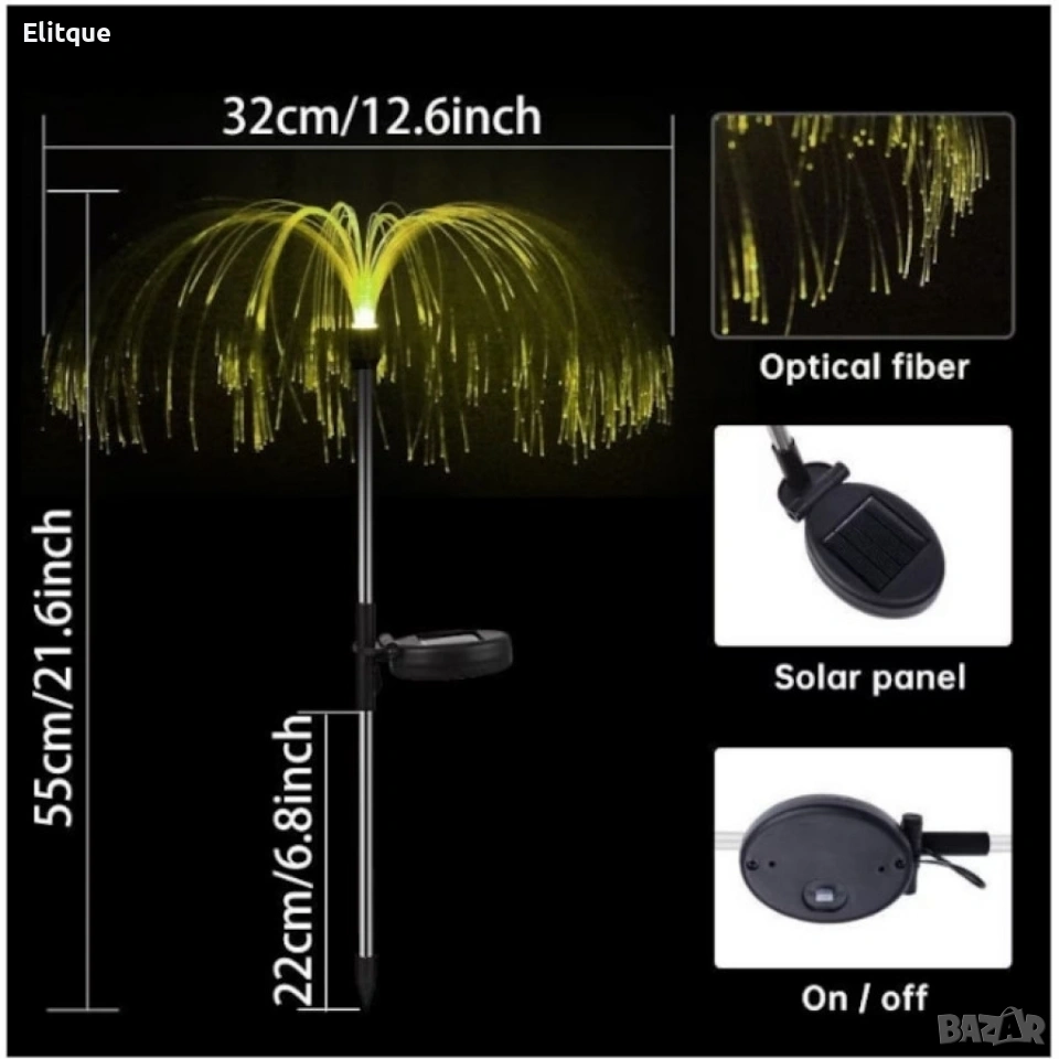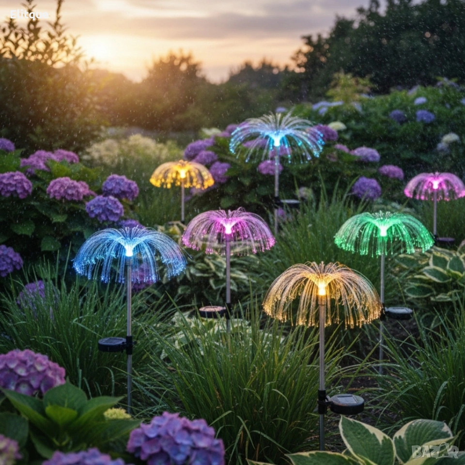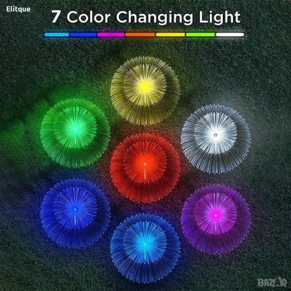 Тип осветление: RGB LED Брой цветове: 7 сменящи се цвята Захранване: Вграден соларен панел Материал: Оптично влакно и устойчива пластмаса Водоустойчивост: IP65 Автоматично включване/изключване: Да (вграден светлинен сензор) Време на работа: 8–12 часа след пълно зареждане Размери (приблизително): височина 55 см, диаметър на короната 32 см Варианти: 1, 2, 3, 4, 5 или 6 броя