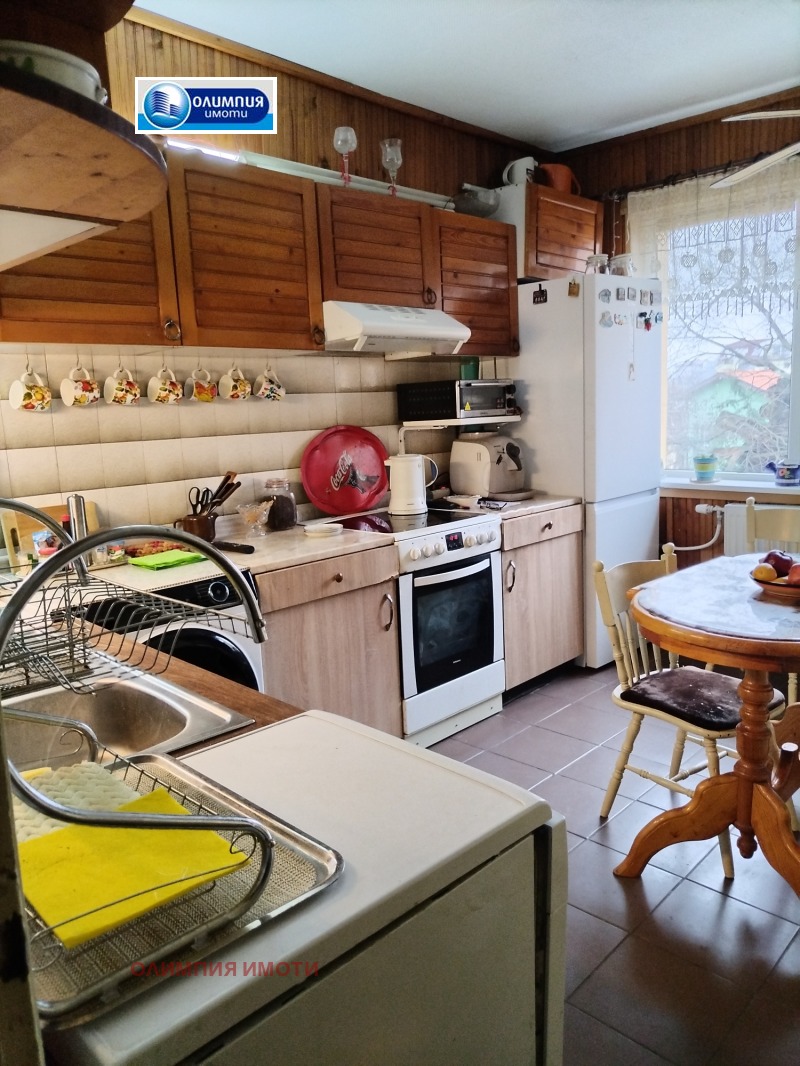 Към вторият етаж се подхожда отново чрез масивно и светло стълбище, където са разположени три стаи, кухня, килер и санитарен възел. От едната стая има подход към голям, светъл, топъл и много уютен балкон с чудесна панорама към града. Къщата е топло изолирана. Отоплява се с локално парно на пелети , а се охлажда с три климатика. Има монтиран и слънчев панел, който е прекрасно решение за слънчевите месеци.