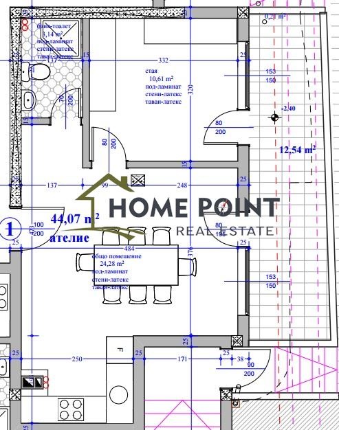 Имотът се състои се от дневна с кухненски тракт и излаз на тераса 12.54 кв.м., спалня с излаз към терасата, смесено санитарно помещение.