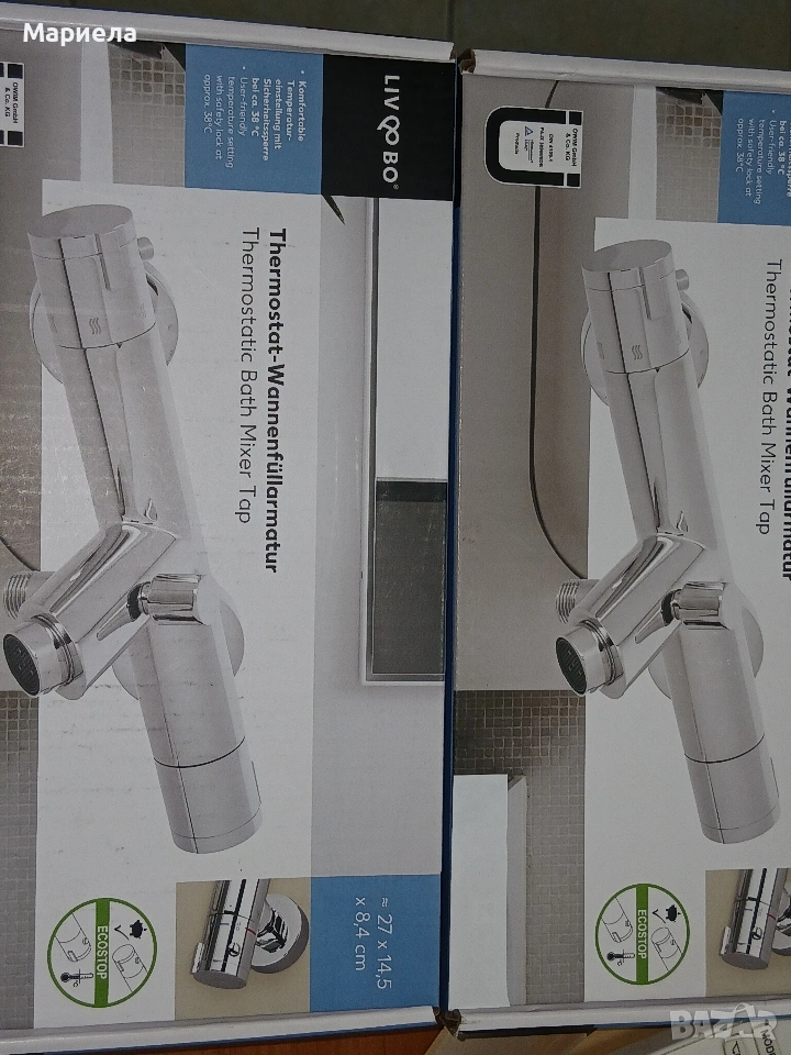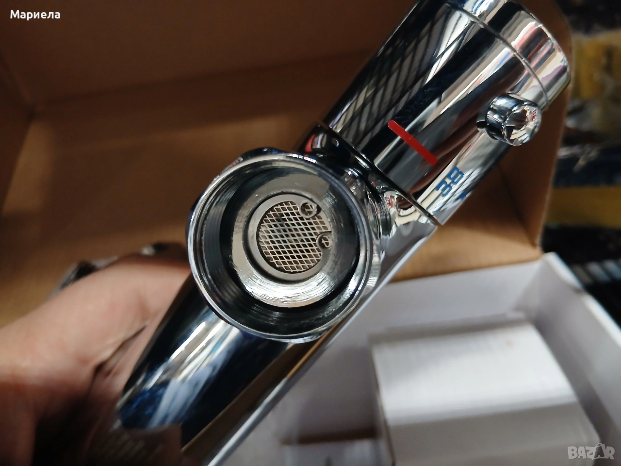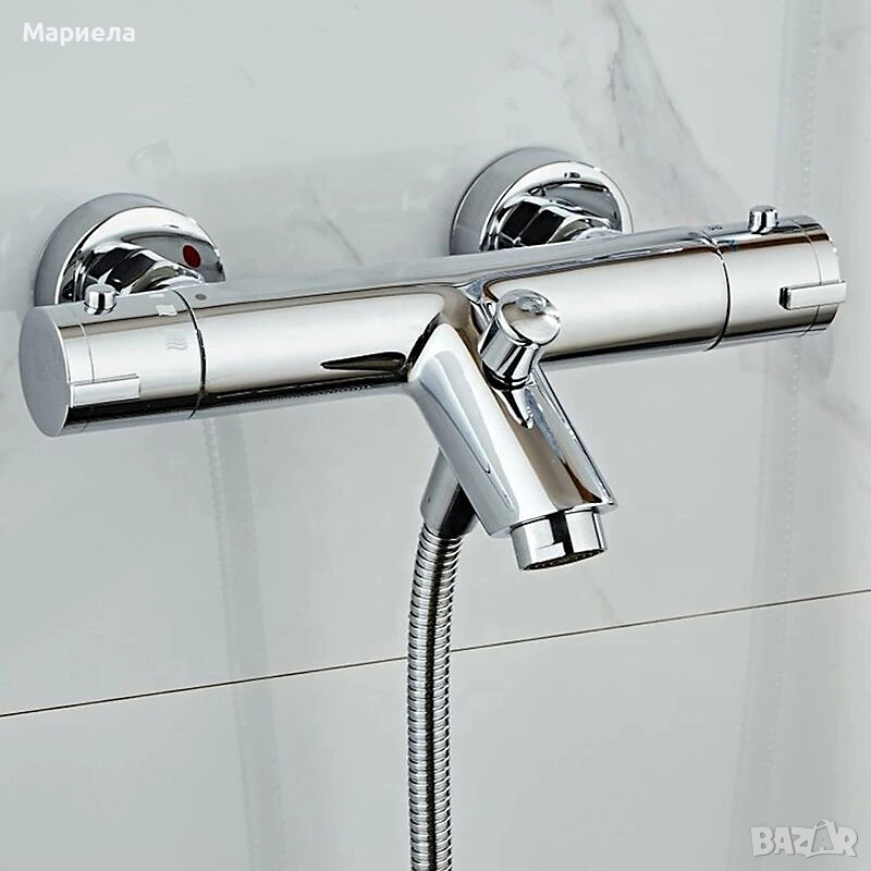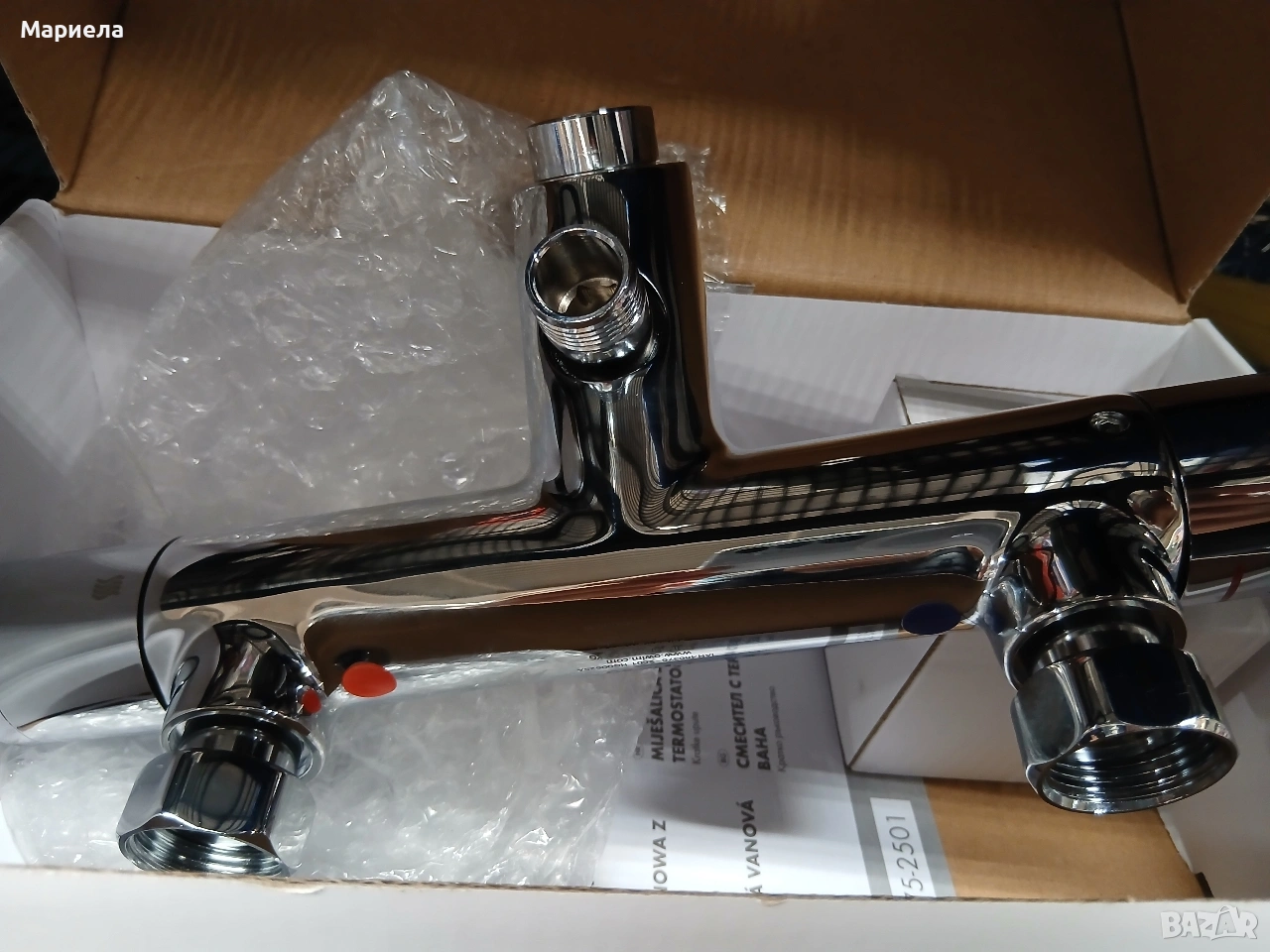 Масивен Смесител с термостат за вана. Удобна настройка на те температурата с предпазна блокировка при ок. 38 °С Хромиран корпус от устойчив стойчив на корозия месинг - неутрален към питейна вода Функцията Eco Stop пести вода и енергия Включително вложка за аератор, аничаващ лотока атор, огранич ествена горна Устойчив на износване вентил с висококачествени части с керамична шайба за душ Стандартен фитинг 21 mm (G 1/2") за закрепване на шлаухи за Фитинг за студена и топла вода, с филтър и вграден възвратен клапан Изводи с редуктор на шумовете Лесна инсталация с пробиване на 2 отвора -ВКЛ. части и инструкции за монтаж Размери: ок. 27 х 14,5 x 8,4 cm Не е подходяща за уреди с ниско налягане и малки резервоари Подходящ за всички водни системи под налягане, като централно отопление, проточни или стандартни бойлери и други Моля, съхранявайте опаковката, тъй като тя съдържа важна информация. Нови. Фабрично запечатани закупени от Германия. Отвореният за снимките е продаден.