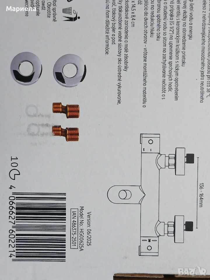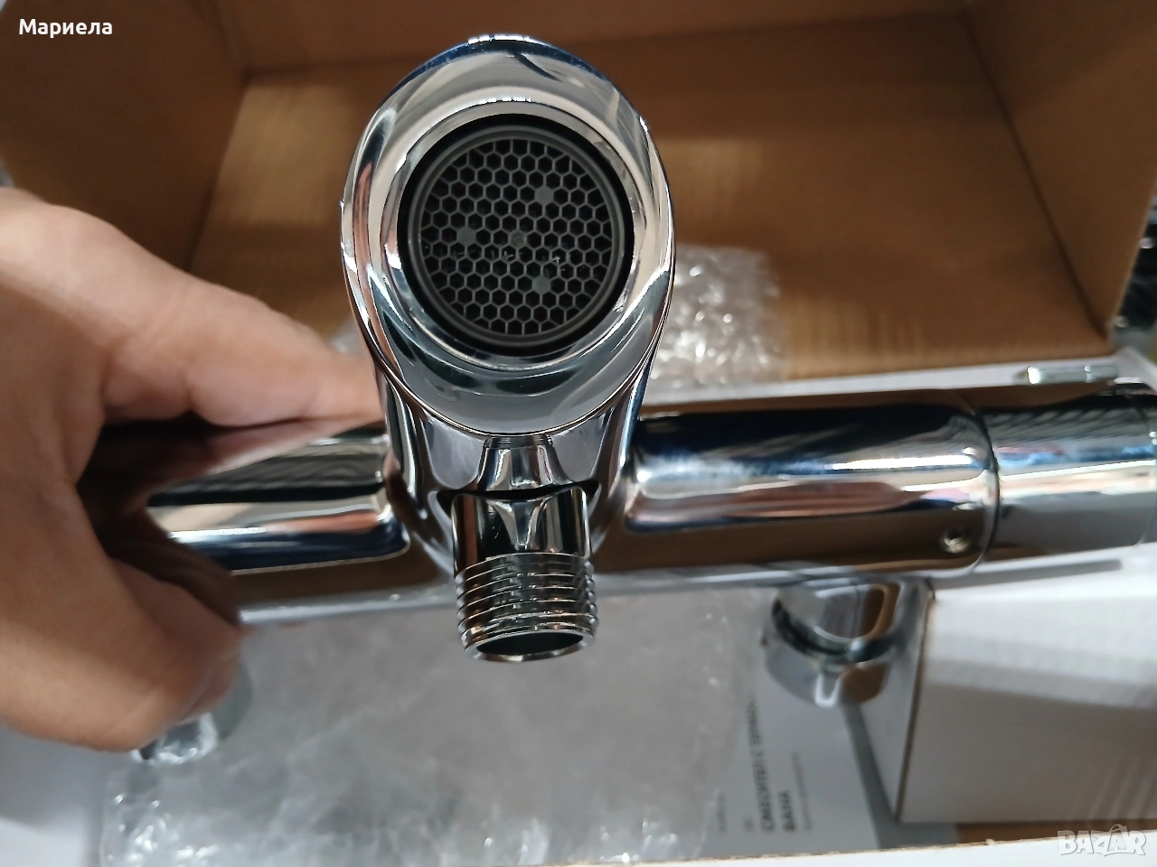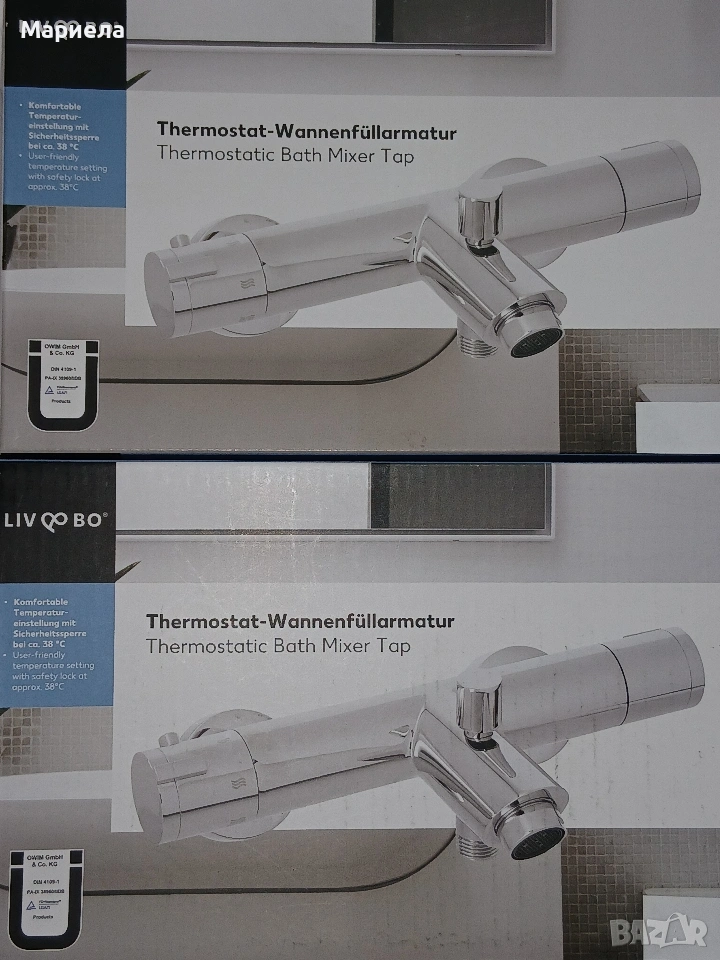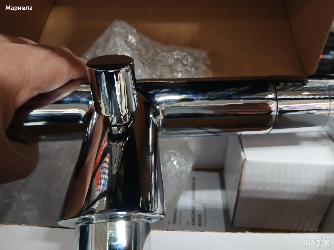 Масивен Смесител с термостат за вана. Удобна настройка на те температурата с предпазна блокировка при ок. 38 °С Хромиран корпус от устойчив стойчив на корозия месинг - неутрален към питейна вода Функцията Eco Stop пести вода и енергия Включително вложка за аератор, аничаващ лотока атор, огранич ествена горна Устойчив на износване вентил с висококачествени части с керамична шайба за душ Стандартен фитинг 21 mm (G 1/2") за закрепване на шлаухи за Фитинг за студена и топла вода, с филтър и вграден възвратен клапан Изводи с редуктор на шумовете Лесна инсталация с пробиване на 2 отвора -ВКЛ. части и инструкции за монтаж Размери: ок. 27 х 14,5 x 8,4 cm Не е подходяща за уреди с ниско налягане и малки резервоари Подходящ за всички водни системи под налягане, като централно отопление, проточни или стандартни бойлери и други Моля, съхранявайте опаковката, тъй като тя съдържа важна информация. Нови. Фабрично запечатани закупени от Германия. Отвореният за снимките е продаден.