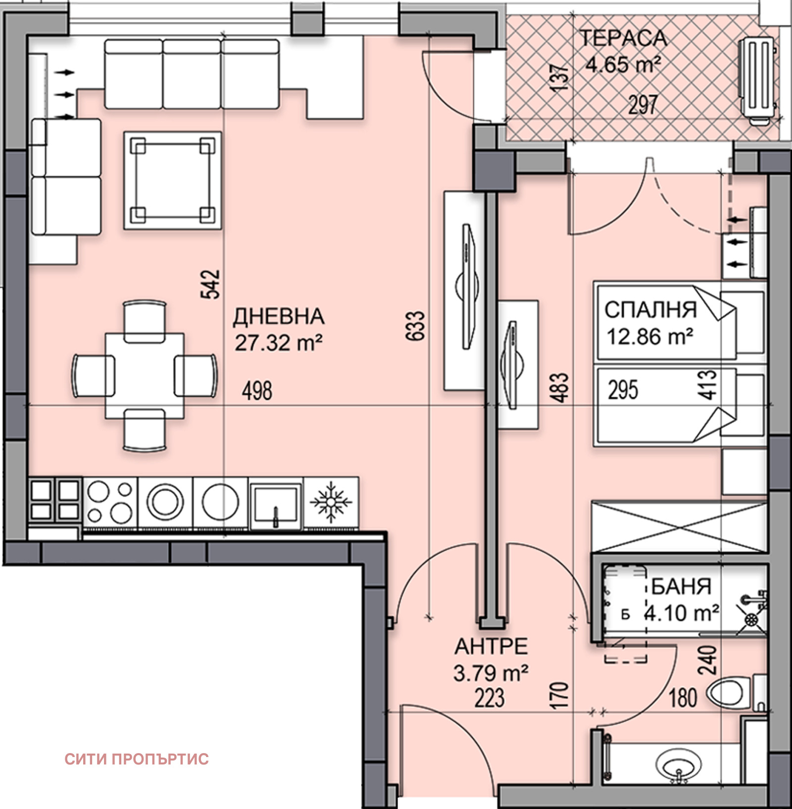 Апартаментът е на девети жилищен етаж, част от секция Б и предлага функционална обща квадратура от 73,24 кв.м. Състои се от спалня (12,86 кв.м.), хол с кухня (27,32 кв.м.), баня с тоалетна (4,10 кв. м.), антре (3,79 кв.м.) и тераса (4,65 кв.м.).