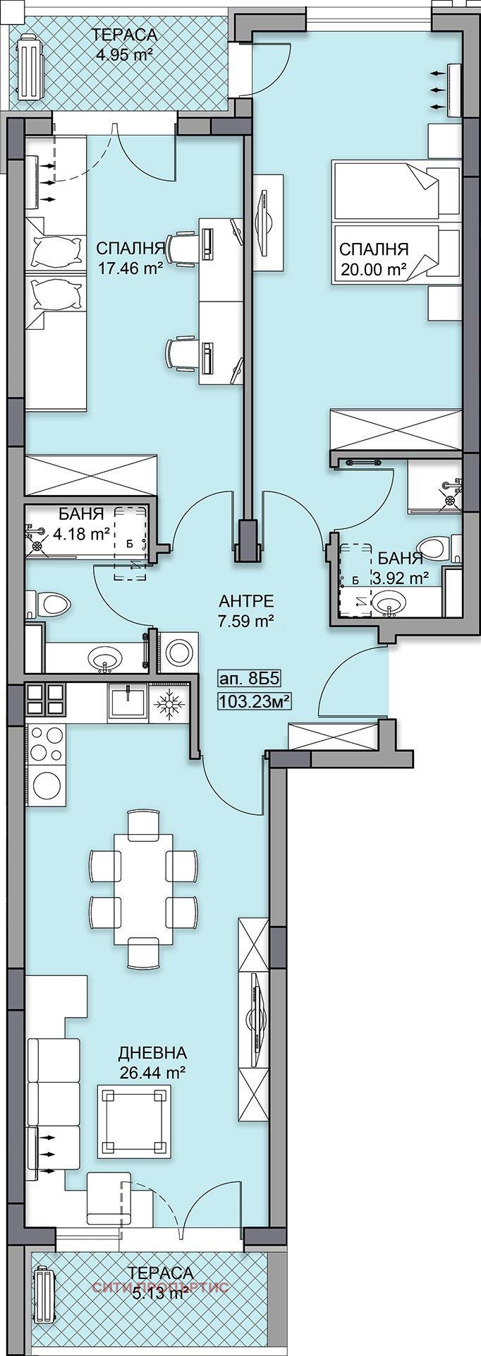 Апартаментът е на осми жилищен етаж, част от секция Б и предлага функционална обща квадратура от 122,46 кв.м. Състои се от спалня (17,46 кв.м.), спалня (20,00 кв.м.), хол с кухня (26,44 кв.м.), баня с тоалетна (4,18 кв. м.), антре (7,59 кв.м.), тераса (5,13 кв.м.), тераса (4,95 кв.м.).