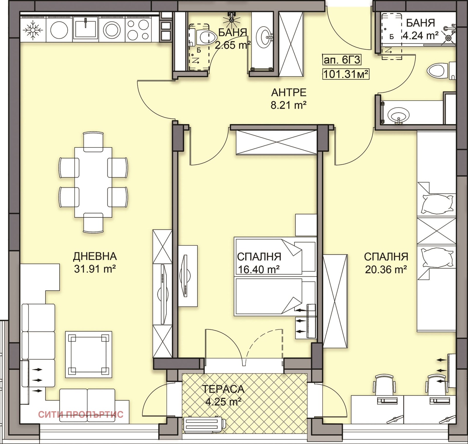 Апартаментът е на шести жилищен етаж, част от секция Г и предлага функционална обща квадратура от 121,47 кв.м. Състои се от спалня (16,40 кв.м.), спалня (20,36 кв.м.), хол с кухня (31,91 кв.м.), баня с тоалетна (4,24 кв. м.), тоалетна (2,65 кв.м.), антре (8,21 кв.м.) и тераса (4,25 кв.м.).