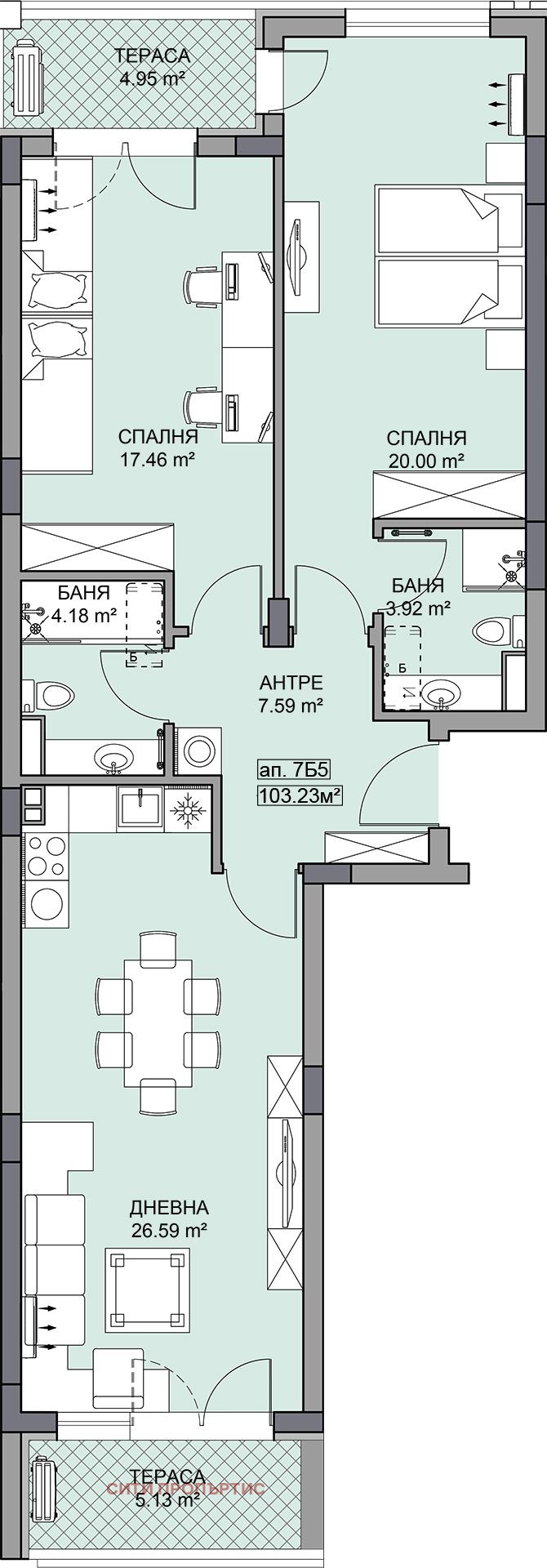 Апартаментът е на седми жилищен етаж, част от секция Б и предлага функционална обща квадратура от 122,46 кв.м. Състои се от спалня (17,46 кв.м.), спалня (20,00 кв.м.), хол с кухня (26,59 кв.м.), баня с тоалетна (4,18 кв. м.), баня с тоалетна (3,92 кв. м.), антре (7,59 кв.м.), тераса (5,13 кв.м.), тераса (4,95 кв.м.).