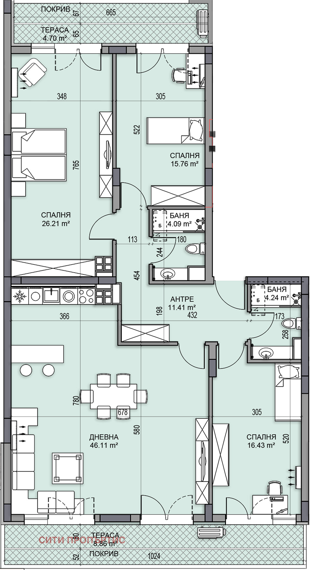 Апартаментът е на дванадесети жилищен етаж, част от секция Г и предлага функционална обща квадратура от 183,70 кв.м. Състои се от спалня (26,21 кв.м.), спалня (15,76 кв.м.), спалня (16,43 кв.м.), хол с кухня (46,13 кв.м.), баня с тоалетна (4,09 кв. м.), баня с тоалетна (4,24 кв. м.), антре (11,41 кв.м.), тераса (8,86 кв.м.) и тераса (4,70 кв.м.).