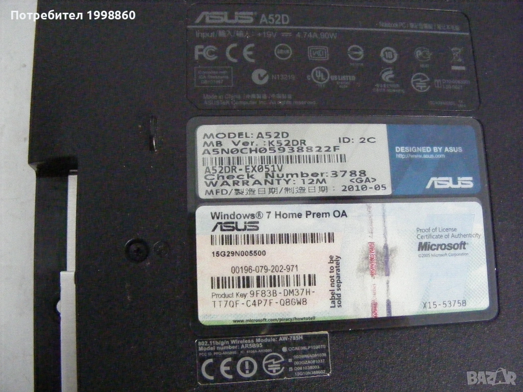 По етикет модела му е A52F, в биоса пише K52Jk, на слота за паметта K52Jb