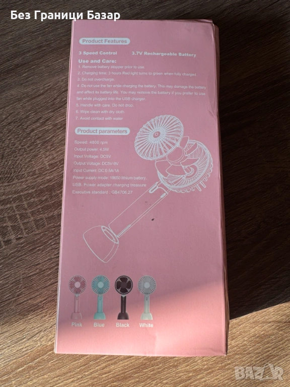 Вентилаторът разполага с 3 степени на скорост, които позволяват да изберете оптималния въздушен поток според нуждите си. Захранва се с вградена презареждаема 18650 литиева батерия (3.7V) и се зарежда лесно чрез USB кабел – от лаптоп, външна батерия или адаптер.