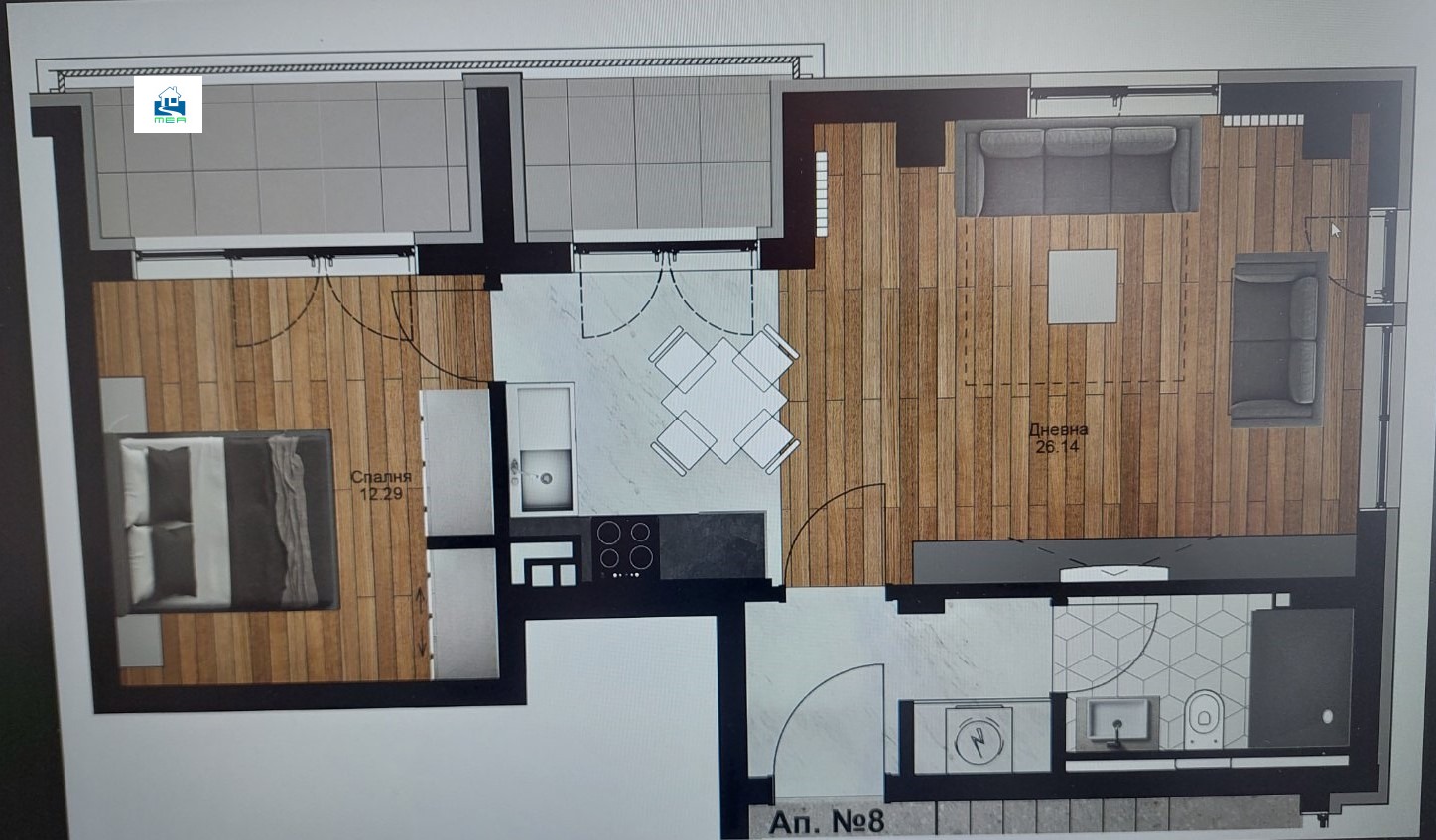 Ателието се състои от : антре, дневна с кухненски тракт / бокс/, спалня (преходът е спалня-дневна), два балкона на дневната и спалнята, килер и сервизно помещение.