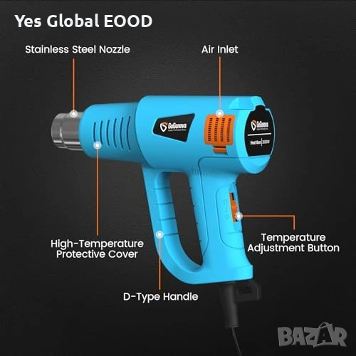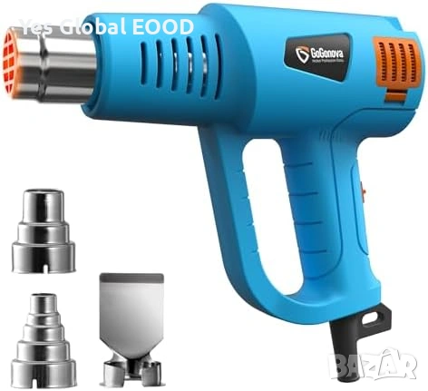 GoGonova пистолетът за горещ въздух е мощен и надежден инструмент с мощност 2000 W, предназначен за бързо нагряване само за 1.5 секунди. Разполага с две температурни степени – 300°C и 650°C, както и регулируем въздушен поток от 240 до 450 л/мин. Подходящ е за премахване на боя, термосвиваеми тръби, огъване на пластмаси, размразяване и други ремонтни и монтажни дейности. В комплекта са включени 3 накрайника за различни приложения.