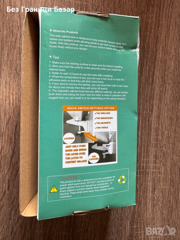 Заключалките се монтират без пробиване и без инструменти, чрез здраво лепящи подложки. Механизмът позволява лесно отключване от възрастен, но е труден за отваряне от дете. Подходящи са за повечето стандартни мебели.