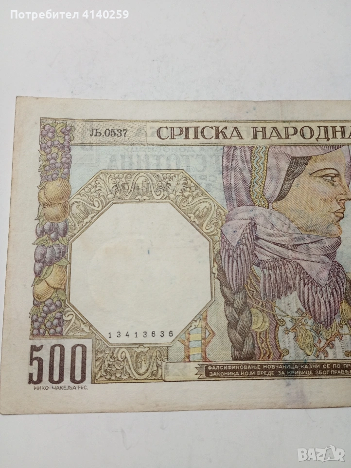 СЪРБИЯ БАНКАТА 500 ДИНАРА 1941 Г → Обява 53339650