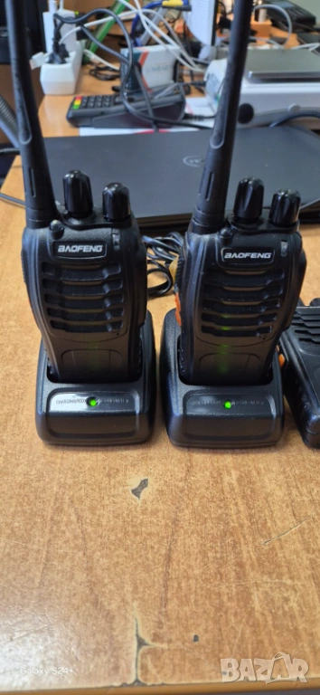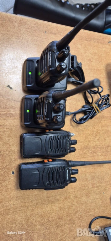 4бр.радиостанций със 2бр. зарядни обхват 4-5км. едната няма антенка ама не пречи на работата