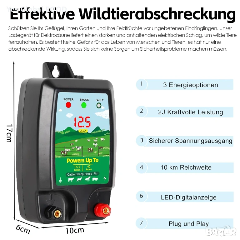 Warmfay електропастирът 12V е надеждно устройство за защита на животни и имоти чрез електрическа ограда. Осигурява изходна енергия 2 джаула и ефективен обхват до 10 км. Оборудван е с LED дисплей за лесно наблюдение на работното състояние. Водоустойчивият корпус позволява външен монтаж и сигурна работа при различни атмосферни условия. Подходящ е за защита на добитък, домашни любимци, птици, пасища и градини.