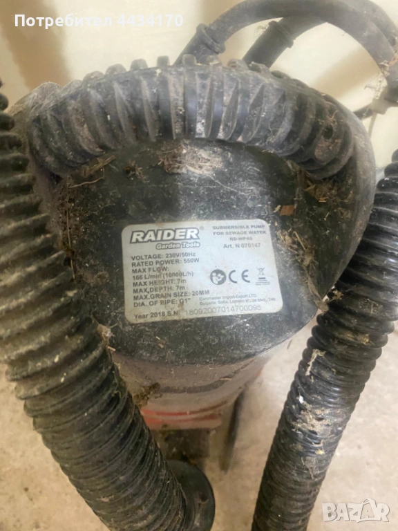 Продавам потопяема помпа за изпомпване на отпадни води на марката Raider, модел RD-WP40. Уредът е дефектен и се продава за ремонт или за резервни части.