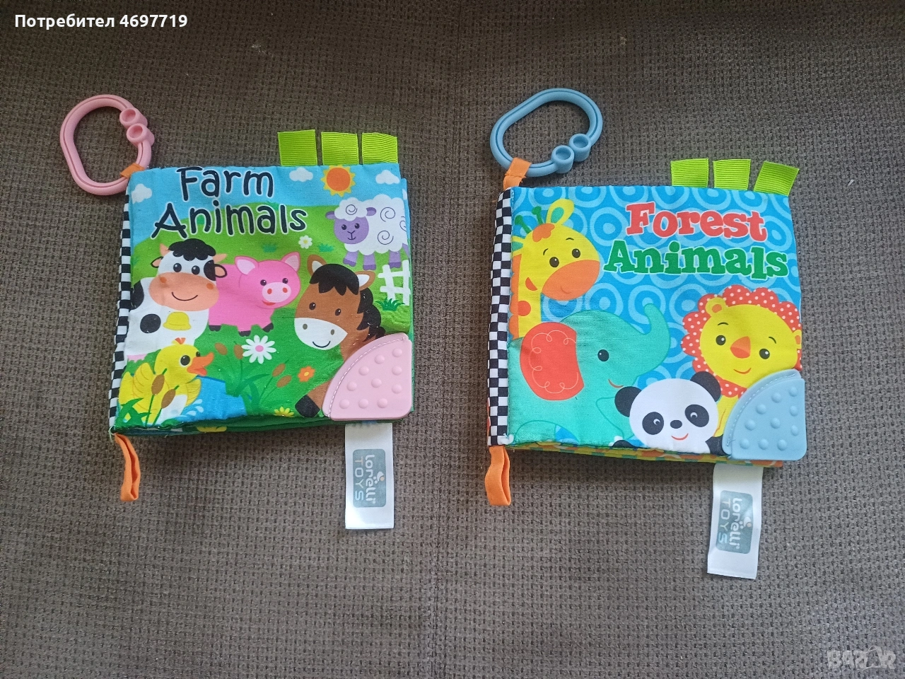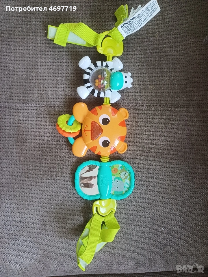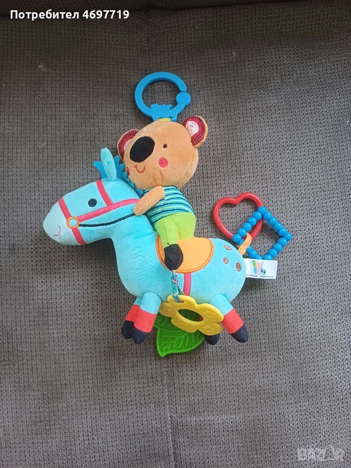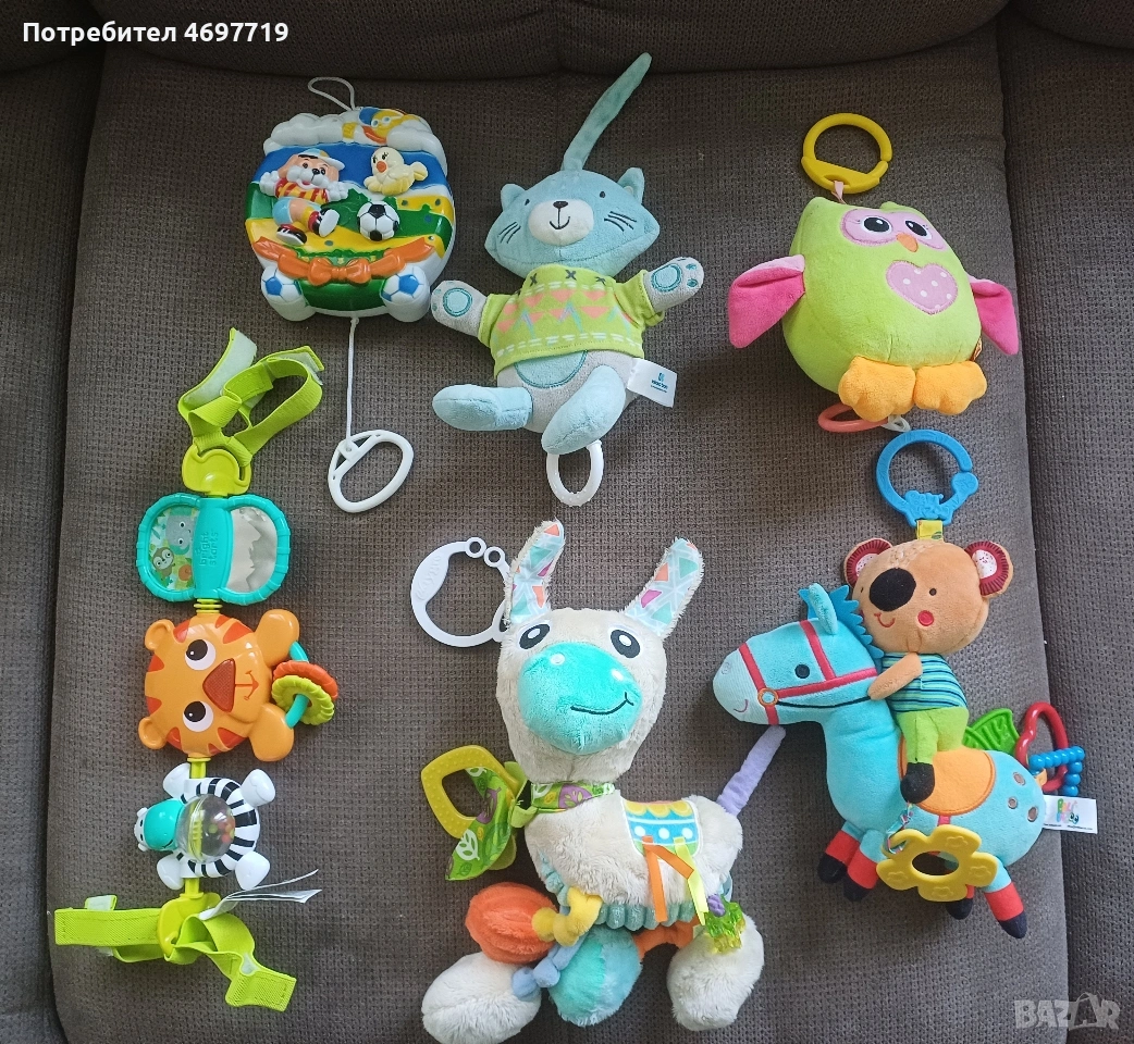 Предлагам нови музикални, сензорни играчки и шумящи книжки. Снимка 1. Цената за всички заедно е 30 евро. Снимка 2 Музикална играчка за количка, легло и самостоятелна игра с връв. При издърпване на въженцето кучето и топлата се движат, имитирайки игра на футбол. Музиката е нежна и приятна. Цена 8 Евро. Снимка 3 Музикален бухал. Подходящ за количка, легло и самостоятелна игра. Има нежна музика. Цена 6 евро. Снимка 4 Лама. Играчката има различни активности. Развива осезанието на детето. Цена 8 Евро. Снимка 5 Музикално конче с ездач. Подходящ за количка, легло и самостоятелна игра. Има нежна музика, имитираща конски впряг и цвилене. Цена 10 Евро. Снимка 6 Синя музикална котка. Подходящ за количка, легло и самостоятелна игра. Има нежна музика при издърпване на въженцето. Цена 7 Евро. Снимка 7 Музикална играчка с три активни животни. Музикален лъв, който издава звуци при натискане на нослето. Въртяща се зебра и огледалце. Цена 12 Евро. Снимка 8 Две шумящи книжки, с домашните и дивите животни. Подходящ за количка, легло и самостоятелна игра. Цена 7 Евро.