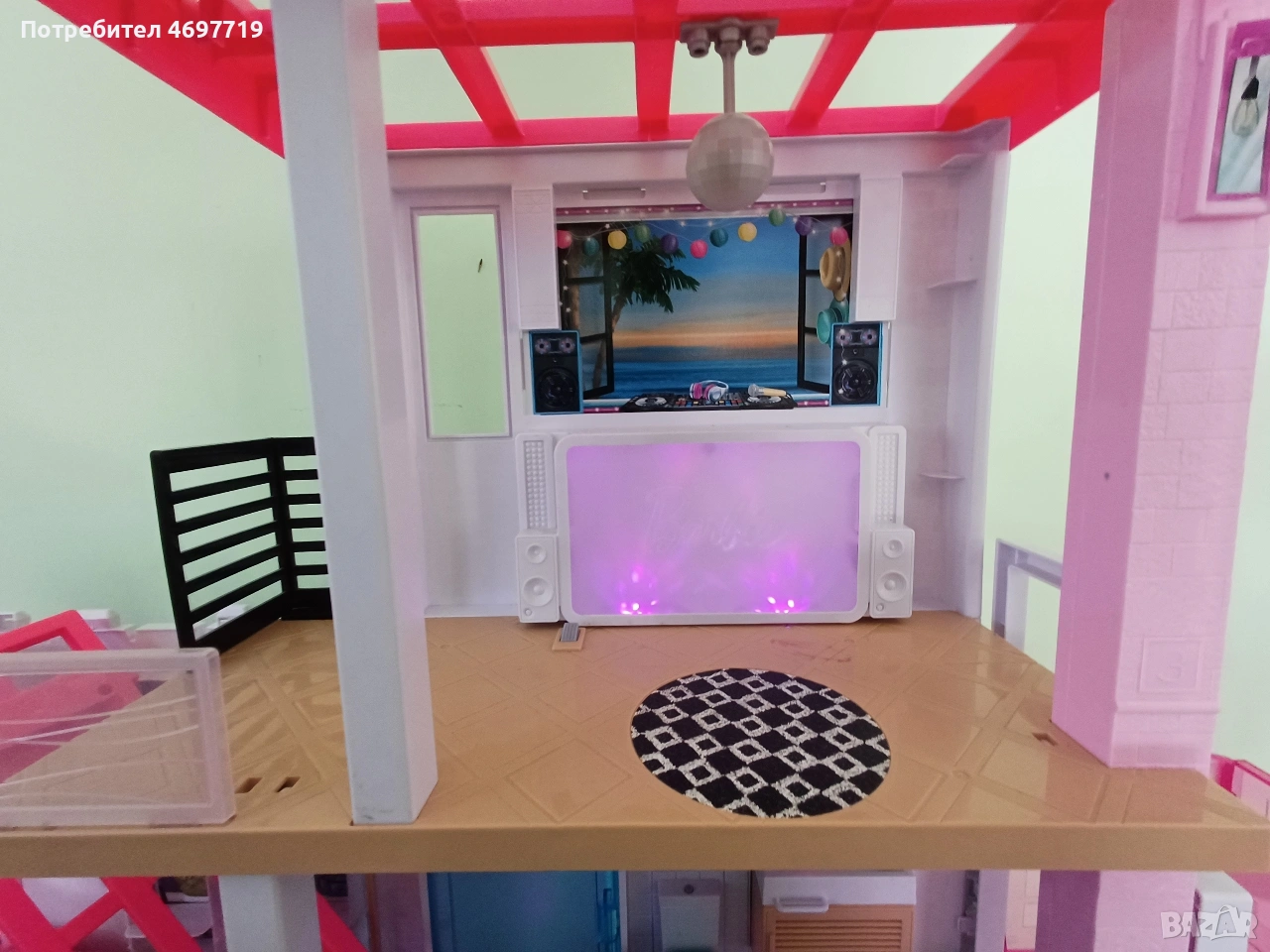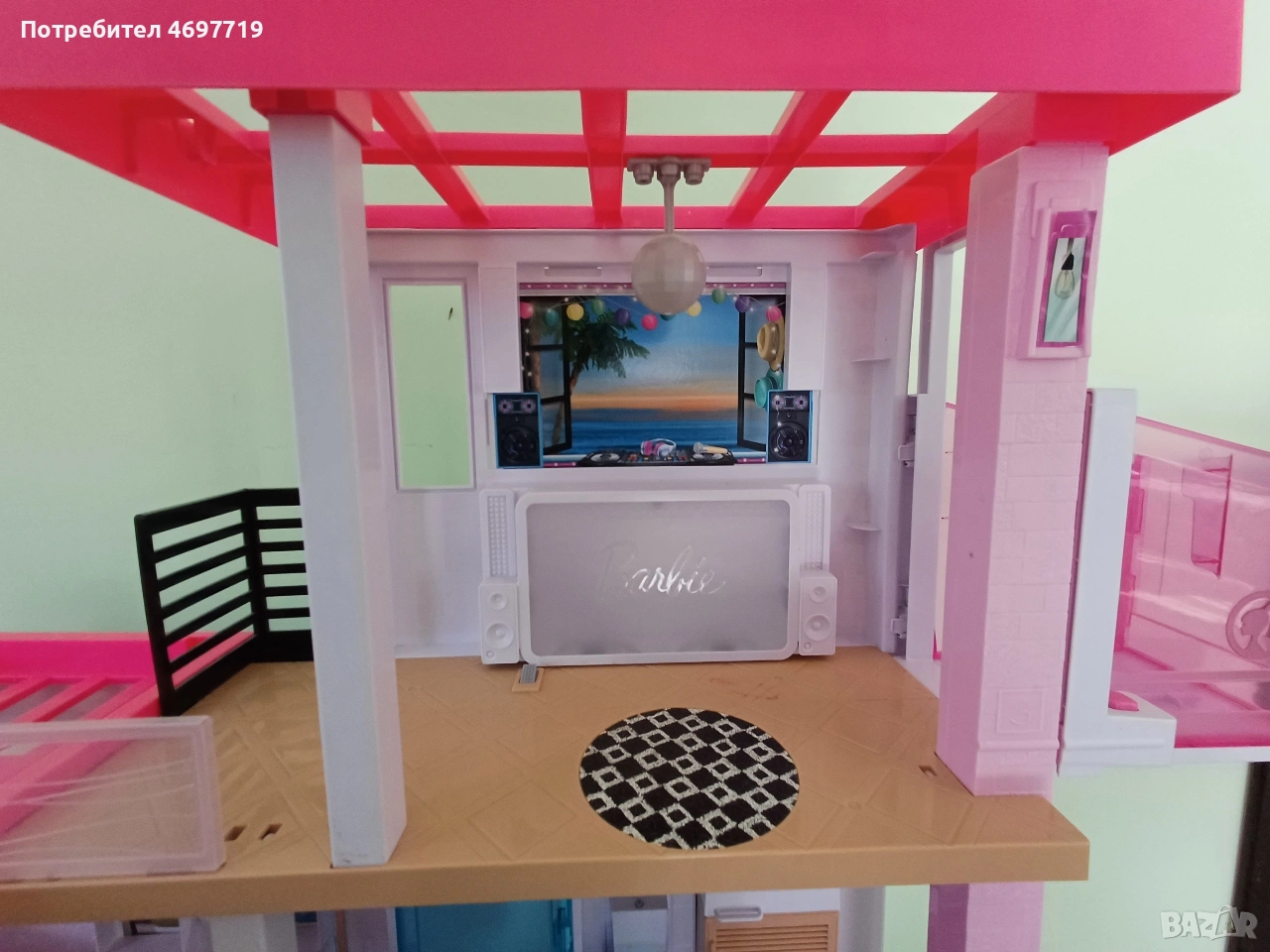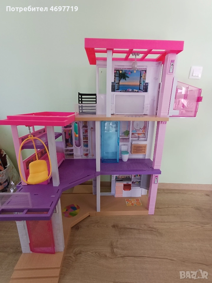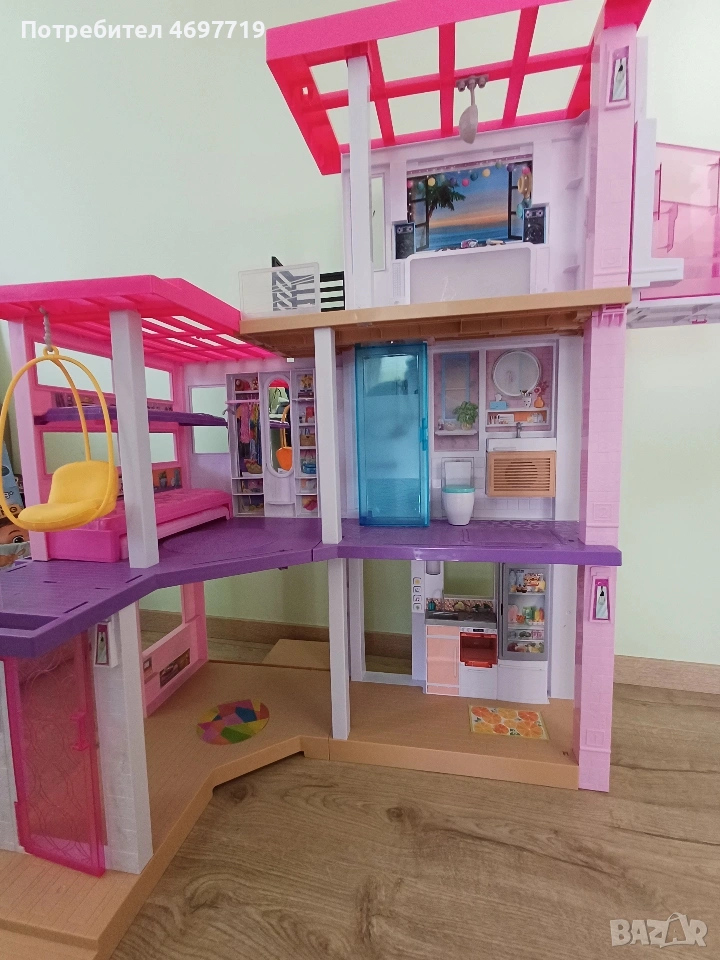 Предлагам страхотна къща на Барби, на три етажа е висока 109 см и широка 104см. Къщата е в отлично състояние, с работещо осветление и звукови ефекти. Звуковите фонове, песните и светлинните настройки позволяват на въображението да пренася историите от деня в нощта или времето за игра да се превърне във време за парти – всичко това с едно натискане на бутона. Асансьора е подвижен. При интерес може да се предложи и обзавеждането й. За по-големи деца може да се използва като част от интериора в детска стая за подреждане на книги и други детски аксесоари и вещи. Цена 180 Евро.