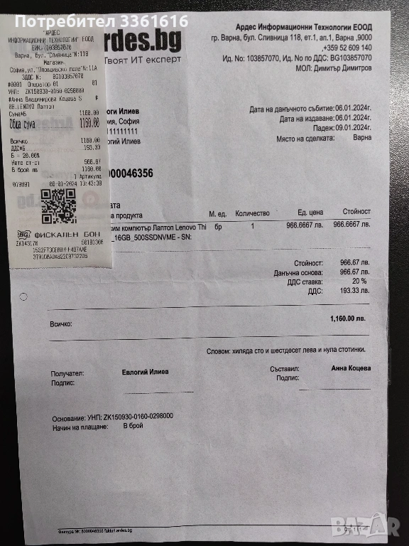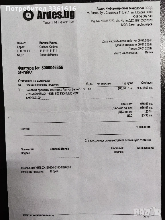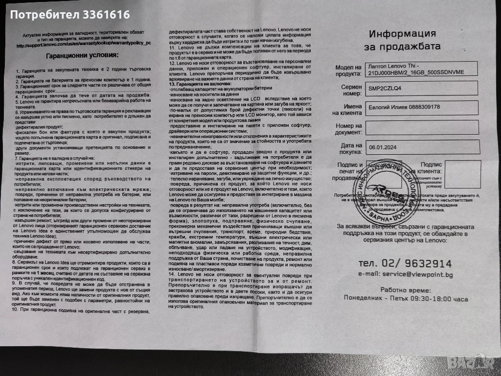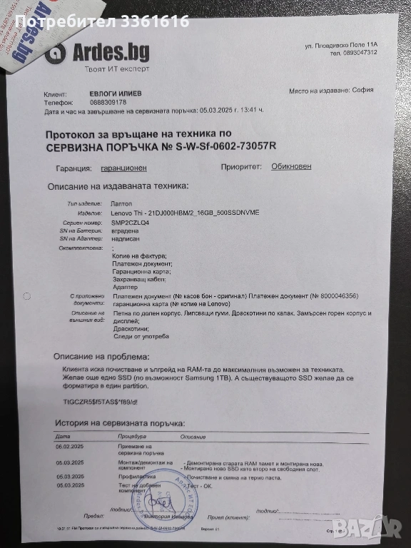 Много съм инвестирал в този компютър. Идва с максималното количество 40ГБ РАМ, което този модел поддържа, два броя SSD и Windows 11 Pro. Едното SSD e 500ГБ Микрон, второто е 1ТБ Самсунг. Цената на нов лаптоп със сходни спецификации е около 2000лв/1000 евро, но и употребяван е горе долу същата стойност, защото моделът е сравнително актуален. Продавам го за 400 евро, понеже има забележки по външния вид и съм се съобразил с това. Пазя всички документи и качвам подробни снимки, на които ясно личи кога и от коя фирма съм закупил компютърът, гаранционна карта, застраховка, разписки за извършени профилактики и надстройки, включително последната миналия месец. Най-напред предложих лаптопа за изкупуване от "Ардес", но те отказаха, защото външният вид не е търговски. Затова продажбата е частна. Закупих си нов по-висок клас машина и тази не ми е нужна. Лаптопът е преинсталиран, така че е изчистена информацията от предишния собственик. Заедно с оригиналното зарядно е готов за работа веднага.