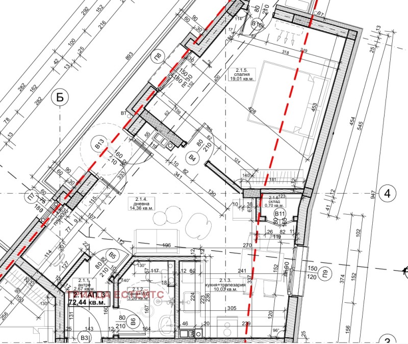 Площта е 82 (ЧЖП- 72) кв.м. разпределена: