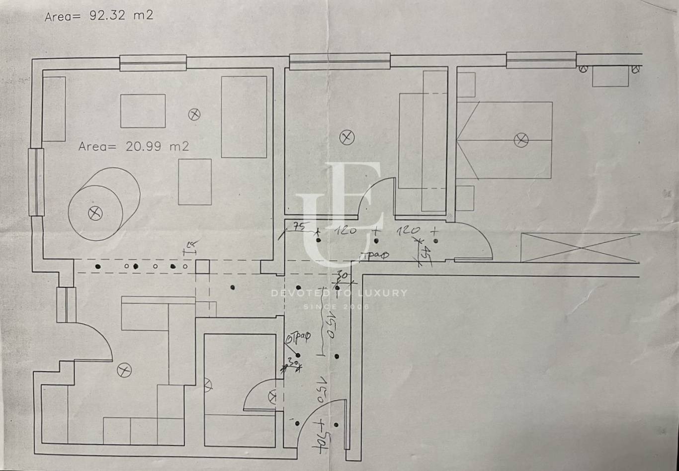Апартаментът е в добро общо състояние, напълно обзаведен, готов за живеене, и предлага функционално разпределение, което включва коридор, всекидневна с трапезария и кухненски бокс с балкон, две спални и баня с тоалетна. Имотът е с площ от 93 кв.м, разположен на 4-ти етаж от 5, без асансьор, с изложение изток юг-запад и светлата височина от 2,94 м. във всички помещения, което осигурява отлична естествена светлина и усещане за простор. Отоплението е решено с ТЕЦ и климатици.