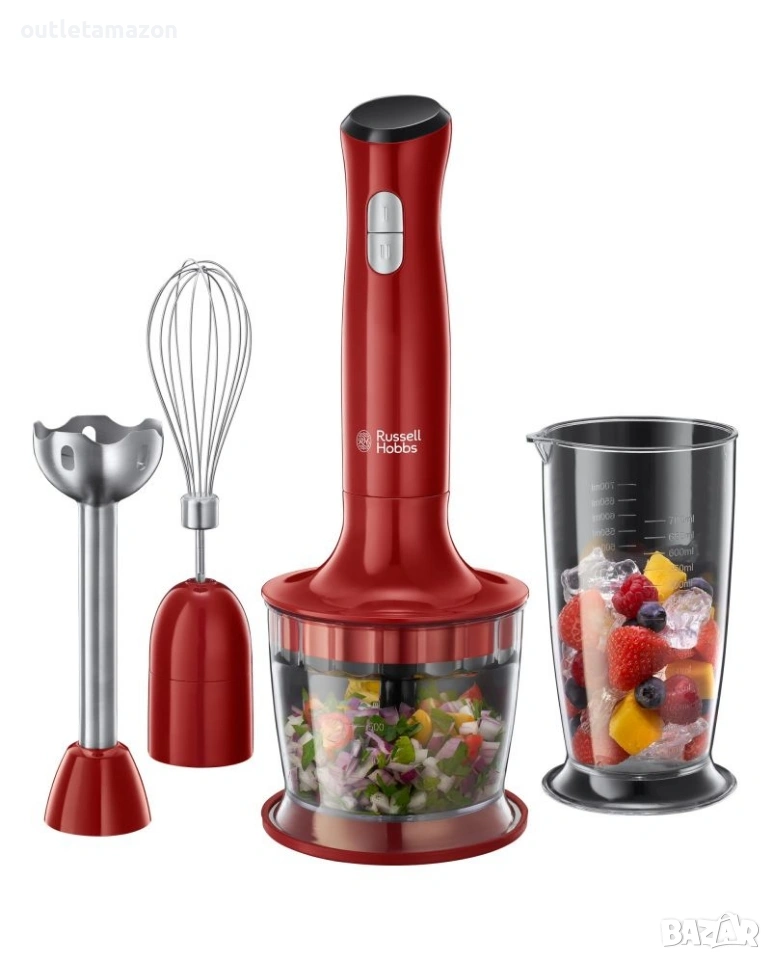 Високооборотен пасатор 3 в 1 с метален накрайник и мощен мотор Russell Hobbs Desire 24700-56 - комплект с чопър купа, миксер кана и бъркалка. Пълен комплект пасатор с който можете да блендирате, смесвате, разбивате, нарязвате и пюрирате. В комплекта ще намерите освен стоманения накрайник за пасиране, накрайник за разбиване и миксиране, 700мл висока купа подходяща за тези дейности, както и ниска 500мл чопър-купа, подходяща за кълцане и рязане. С този комплект пасатор 3 в 1 на Russell Hobbs можете да приготвите крем-супа, майонеза, салати, пюрета, детски храни, дайкири, кремове и най-различни рецепти. Мощност от 500 вата, две скорости и до 12 000 оборота в минута ще Ви помогнат да се справите със всички съставки. - Стоманен пасиращнакрайник - Остриета от неръждаема стомана INOX - Миксер накрайник - Чопър купа: 500 мл - Мерителна купа за смесване: 700 мл - Трайни стоманени остриета - Мощност 500W, до 12 000 оборота - Две скорости - Без вредна BPA пластмаса - Измиване на подвижните част в съдомиялна машина