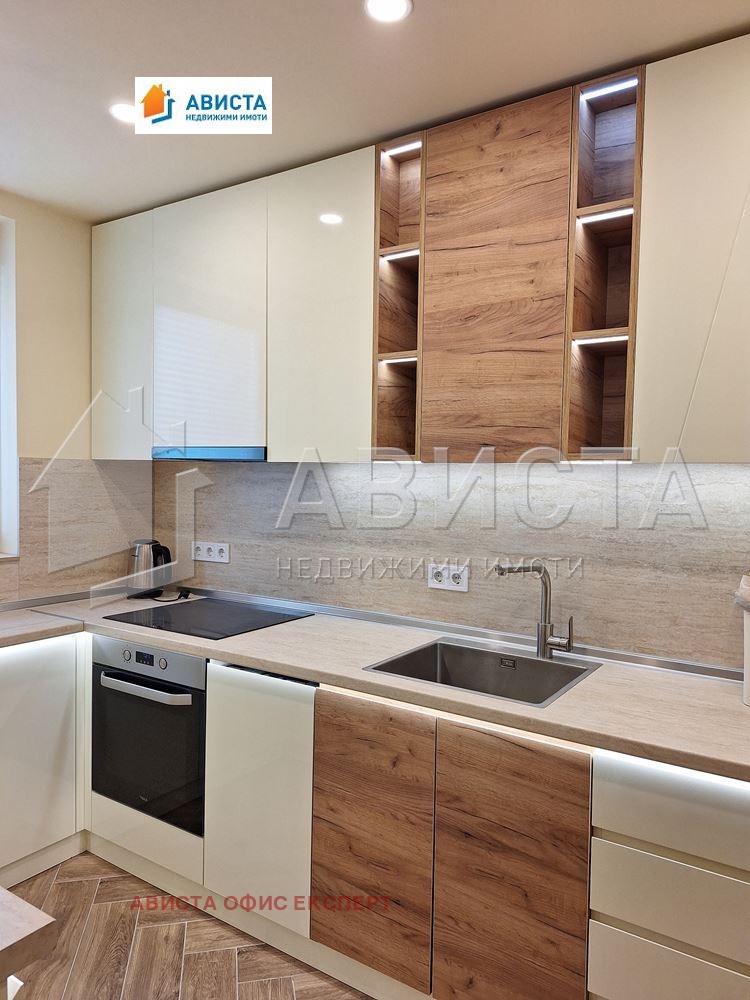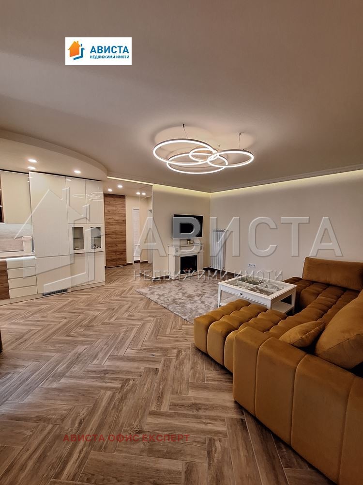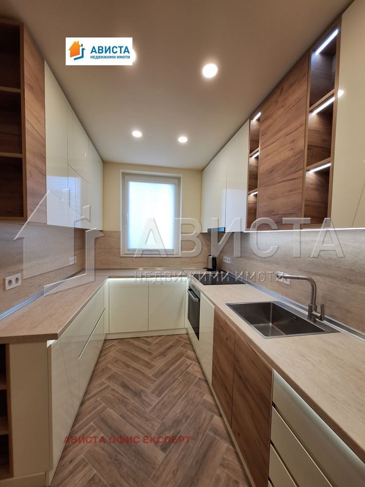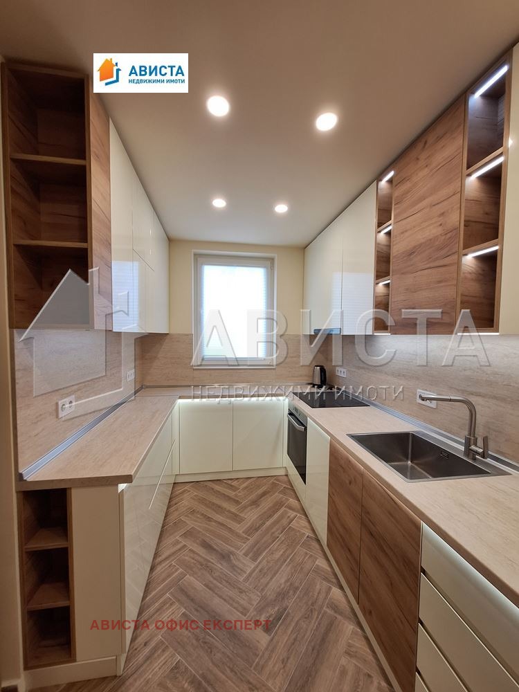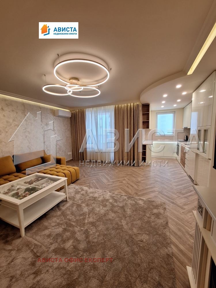 Апартаментът е просторен, луксозен, изпълнен и обзаведен по интериорен проект и поръчка, със специално ЛЕД осветление в помещенията както в хола, така и в кухненската част, която е оборудвана с висок клас вградени чисто нови уреди: фурна, съдомиялна, 4 котлона и хладилник с фризер.