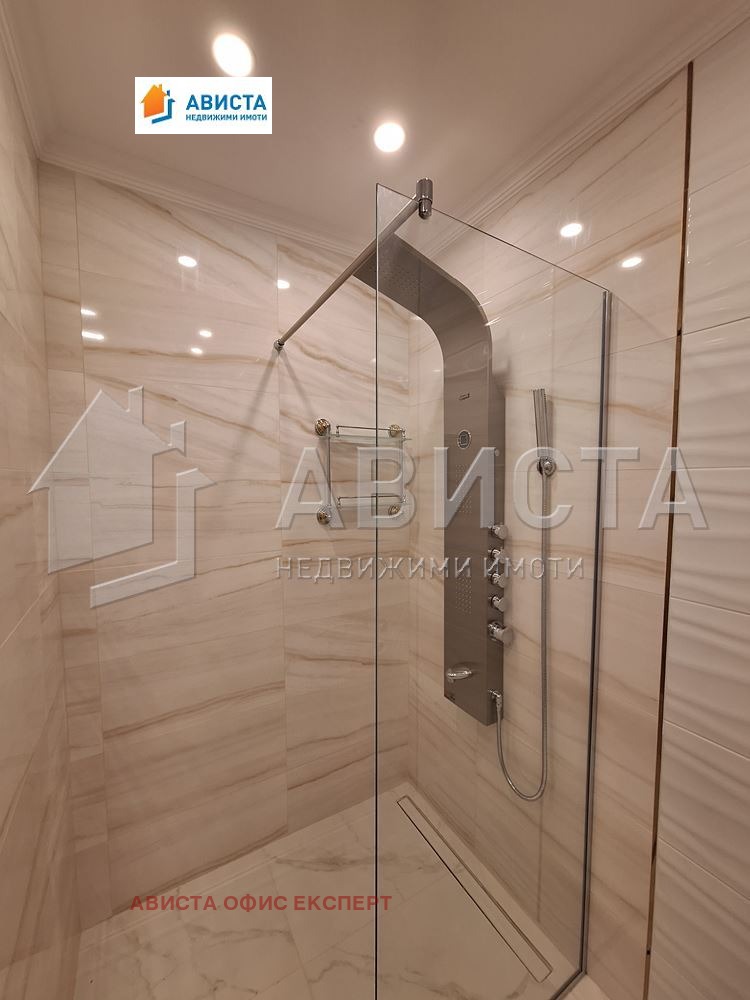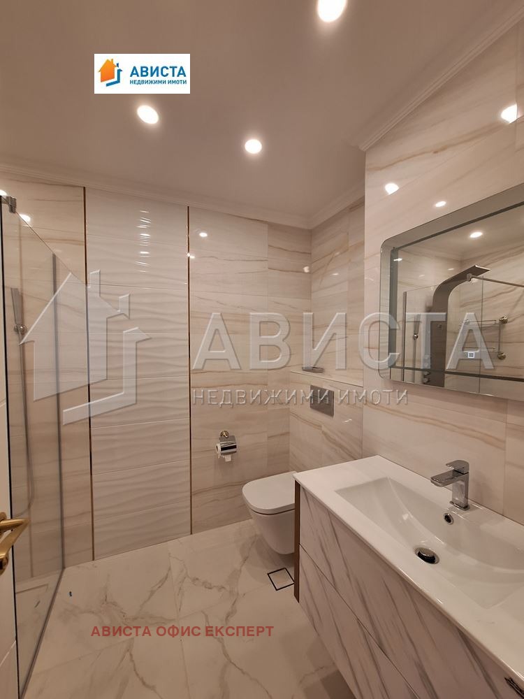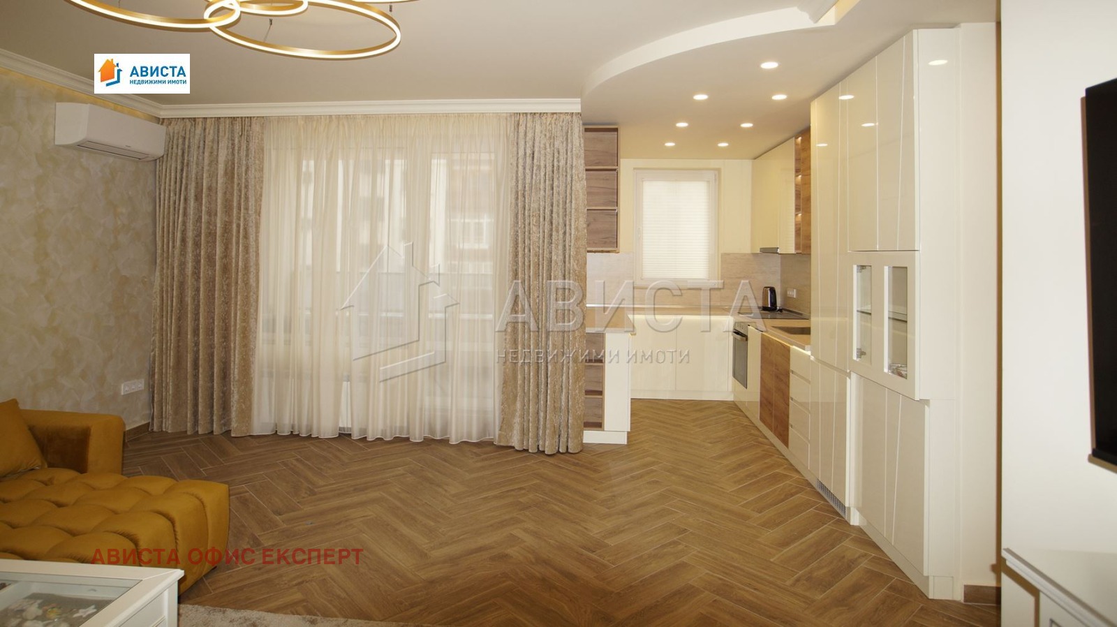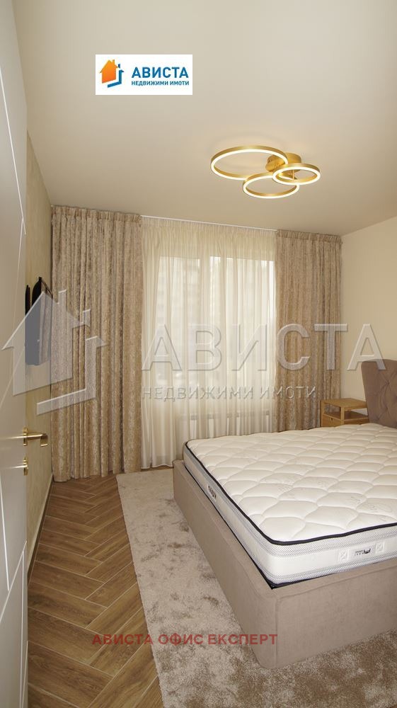 Апартаментът е просторен, луксозен, изпълнен и обзаведен по интериорен проект и поръчка, със специално ЛЕД осветление в помещенията както в хола, така и в кухненската част, която е оборудвана с висок клас вградени чисто нови уреди: фурна, съдомиялна, 4 котлона и хладилник с фризер.