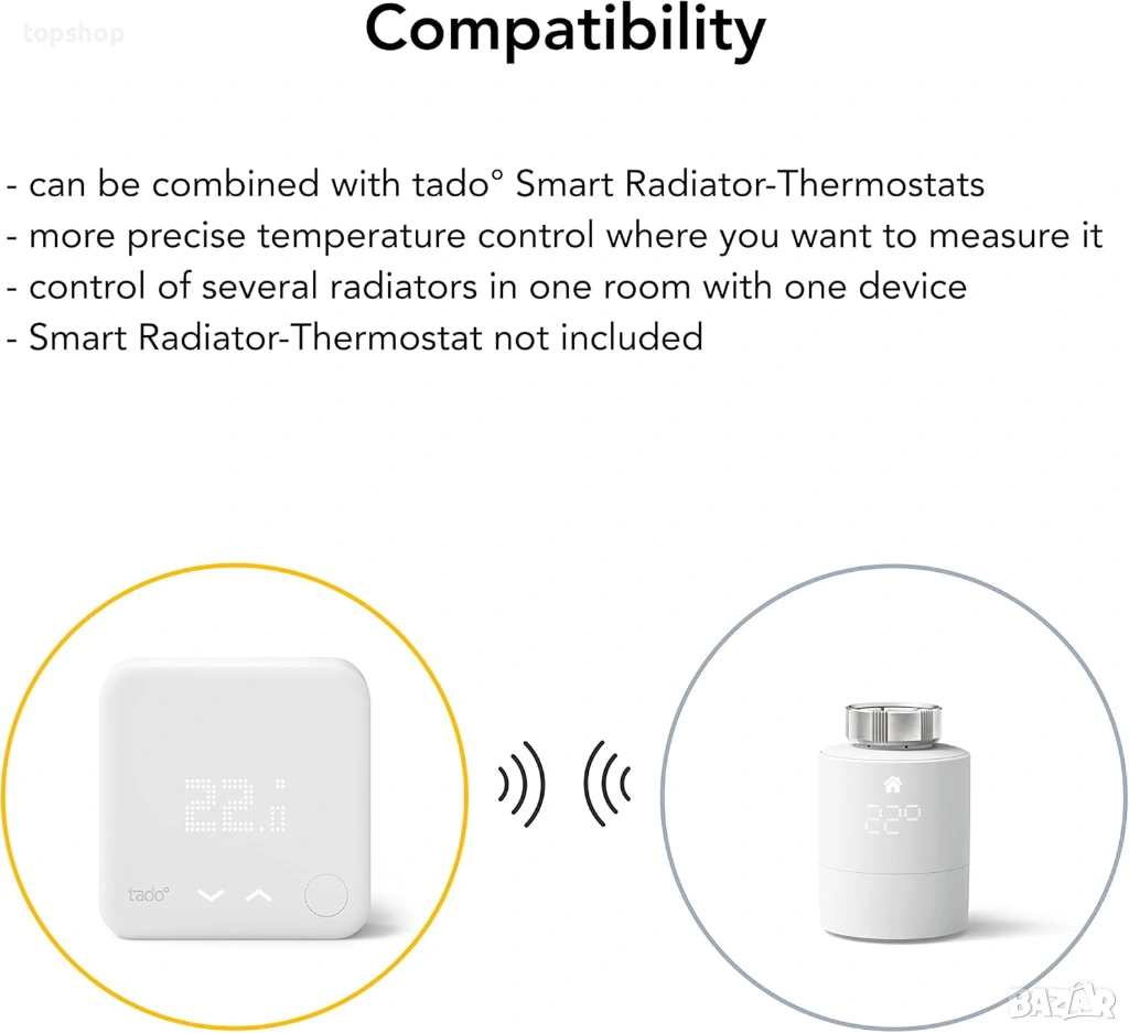 Съвместимост: Изисква интернет мост (Internet Bridge) и стартов комплект tado° (V2, V3, V3+).