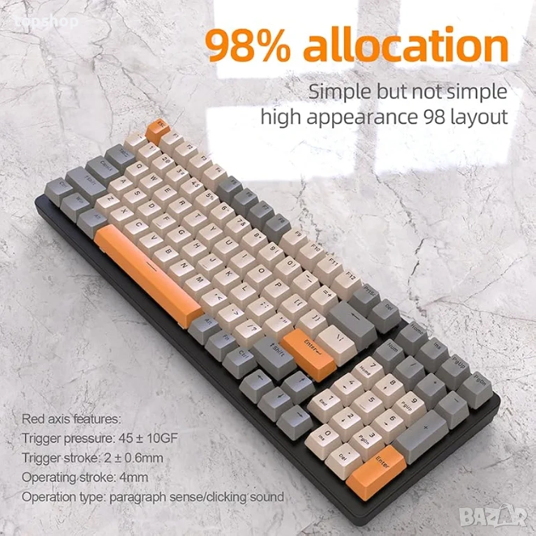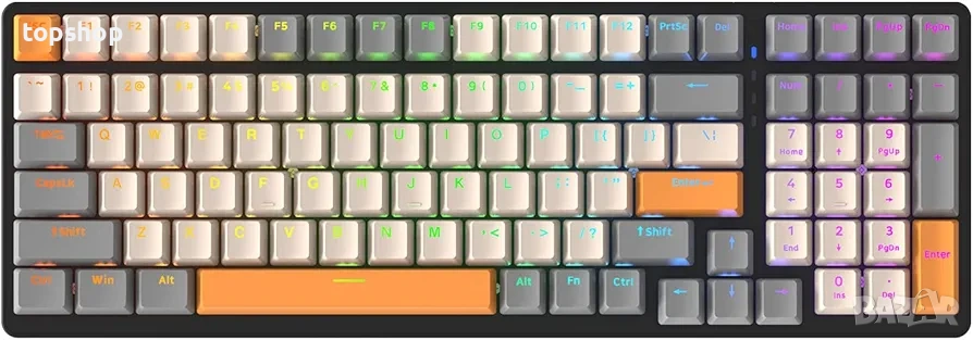 Пълен комплект (100 клавиша): Компактен дизайн, който запазва цифровата зона (Numpad), но заема по-малко място на бюрото.