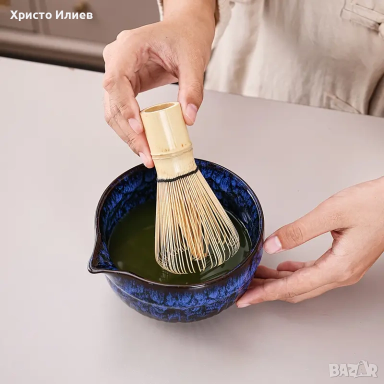 - Инструменти за приготвяне: Висококачествена бамбукова бъркалка (часен) с 80-100 зъба създава гладко, пенливо матча без бучки
