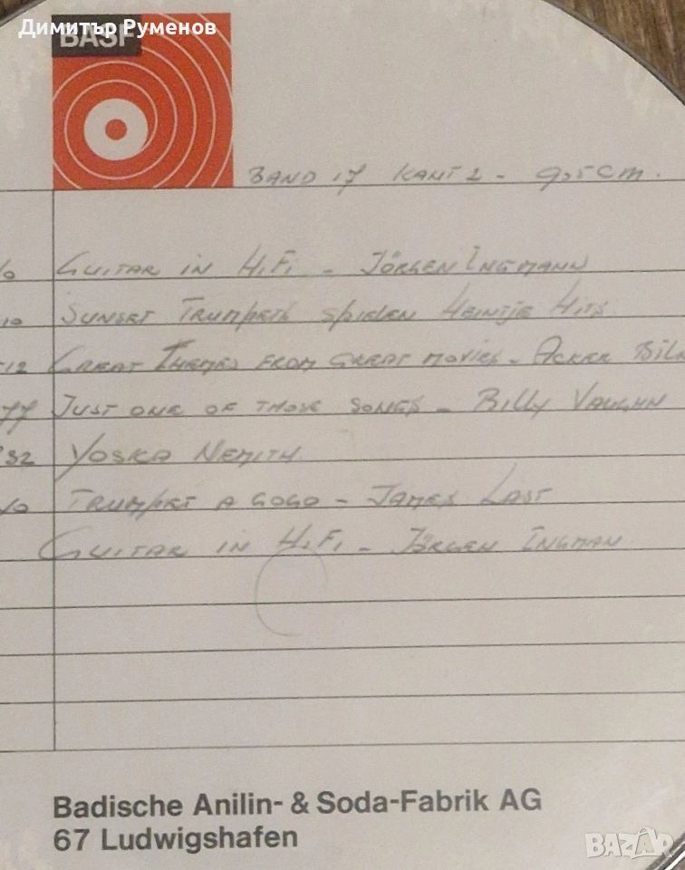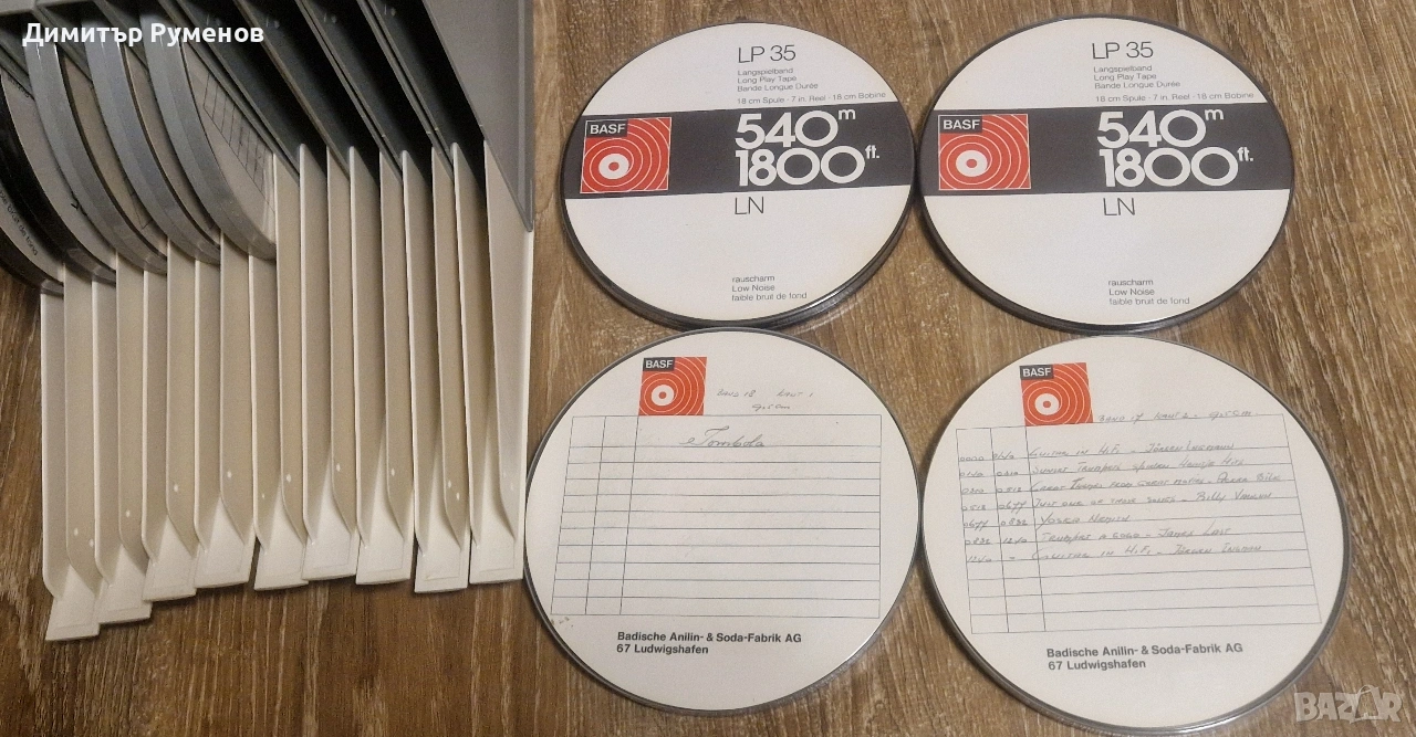 Колекция от 9 броя ролки с лента BASF LP 35 / 18см. Нещо рядко и почти не намираемо, ролките са внос Дания от звукозаписно студио, стари автентични записи на машини висок клас, звучат невероятно.Скорост 9.5см/сек, стерео, 4ри писти.Стил ПОП 60-70те години.Добре съхранени през времето, като нови.