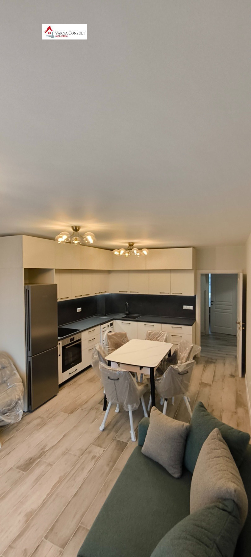 Просторна всекидневна с кухня и трапезария, оборудвана с висок клас енергоспестяващи електроуреди