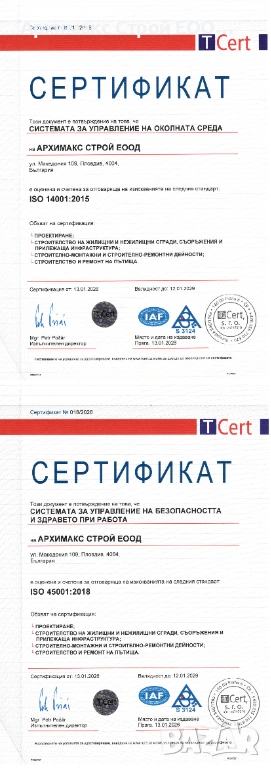 Фирмата разполага с ISO сертификати за качество и е официално регистрирана в Камарата на строителите в България.