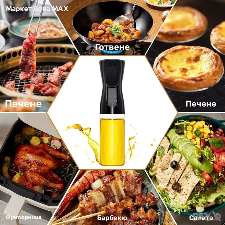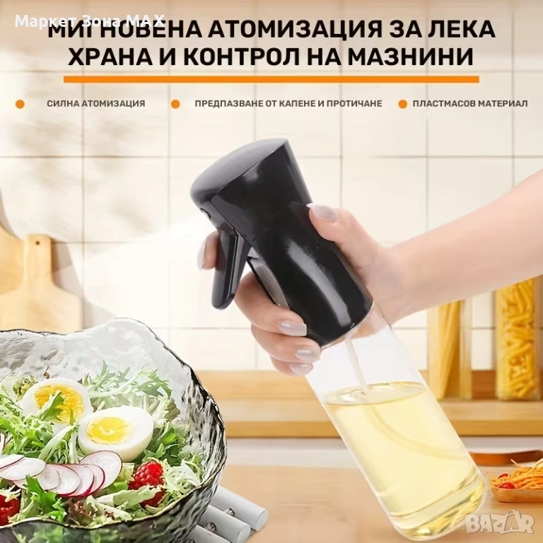 Практичен диспенсер за равномерно и контролирано дозиране на олио, оцет, соев сос, лимонов сок и други течности.