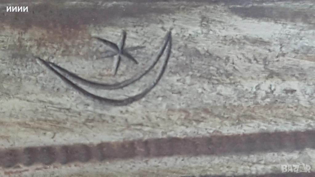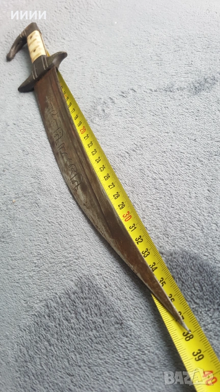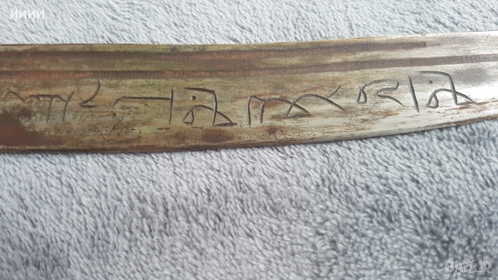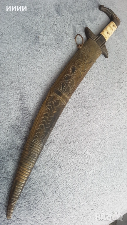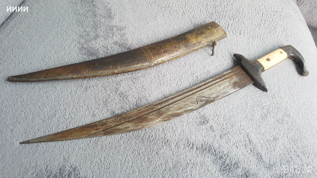 Изкован в средата на 19-ти век. Острието му е с два канала от двете страни, като от едната с арабски надписи, а от другата с полумесец. Дръжка от биволски рог, по средата украсена с камилски кокал, без луфт. Канията е бронзова, отвътре дървена, за да не излиза свободно острието, а с усилие.