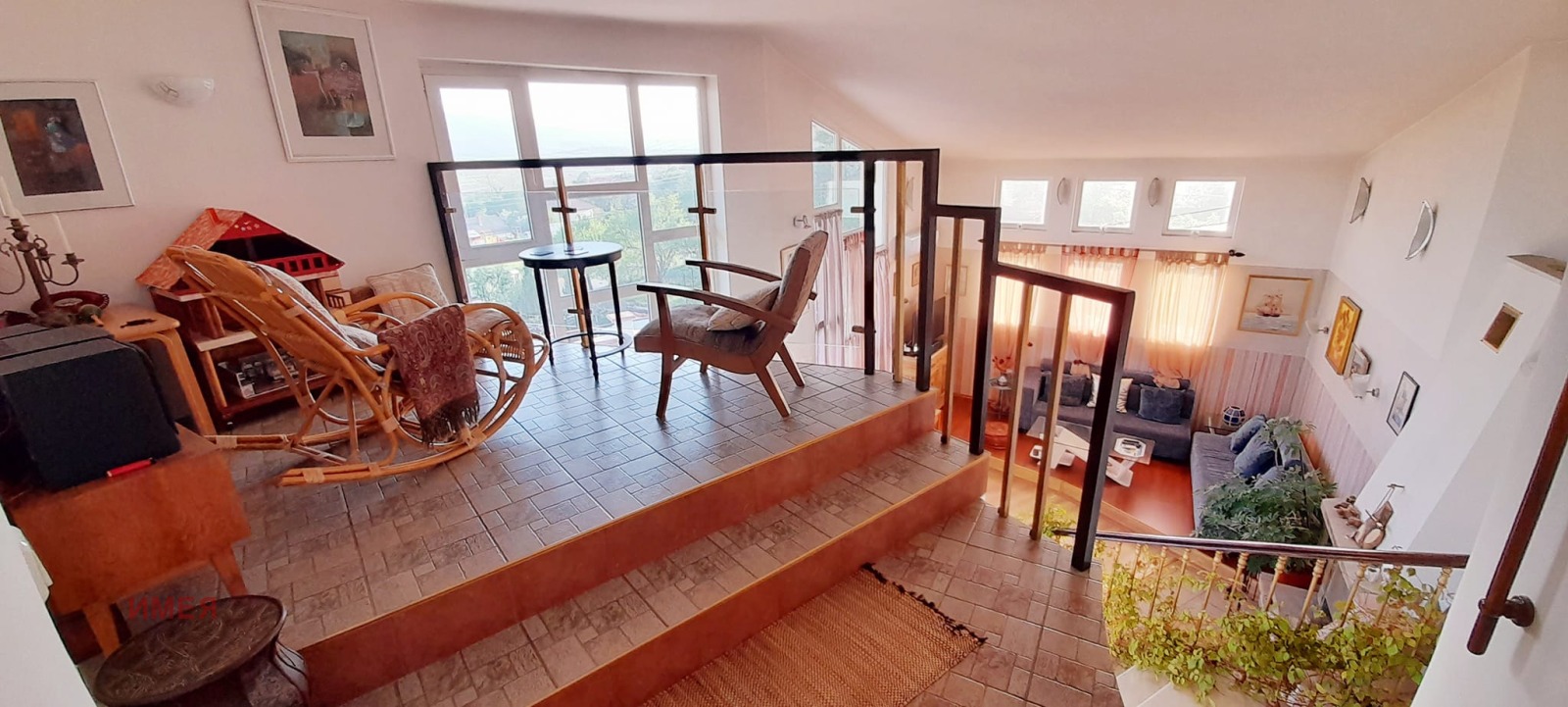 ИМЕЯ продава самостоятелна, луксозна и функционална къща в близост до центъра на гр. Годеч, разположена в ъглов парцел с площ от 700 кв.м. Тухла от 2000 г. Състои се от 3 нива, представляващи 2 самостоятелни апартамента, свързани с вътрешно стълбище, но и със самостоятелни входове от двора. Разпределение: ПАРТЕР: механа, лятна кухня, кухненски бокс, трапезария, дневна, спалня и баня с тоал. ПЪРВИ ЕТАЖ: антре, дневна на 2 нива, тераса 30 кв.м, кухня с трапезария, баня с тоал. и красиво стълбище. ВТОРИ ЕТАЖ: 3 спални, малък балкон и баня с тоал. Южно изложение с прекрасна гледка! Къщата е отлично поддържана, напълно обзаведена и оборудвана с ел. уреди. Има канализация и нов водопровод. Отопление: парна инсталация - радиатори във всички стаи и камина с водна риза. Монтирани са и 2 климатика /в гаранция/. Равен, облагороден двор с много овошки, цветя и жив плет. До къщата се стига по идеален асфалтов път. ИМЕЯ.