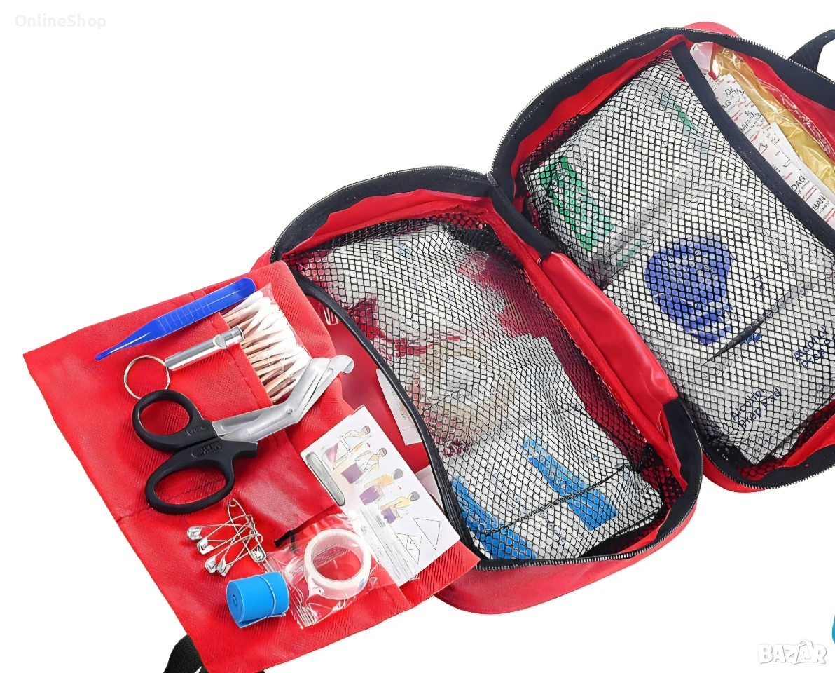 Комплектът за първа помощ е създаден с мисъл за вашето удобство и безопасност. Изработен от водоустойчив PU материал и с издръжлива найлонова конструкция, той е устойчив на абразия и защитава съдържанието от влага и замърсявания. Благодарение на компактния размер и лекото си тегло, лесно ще го носите в раницата или ще го съхранявате в автомобила. Множество джобове в интериора гарантират, че всичко е подредено и лесно достъпно, когато ви е най-необходимо.