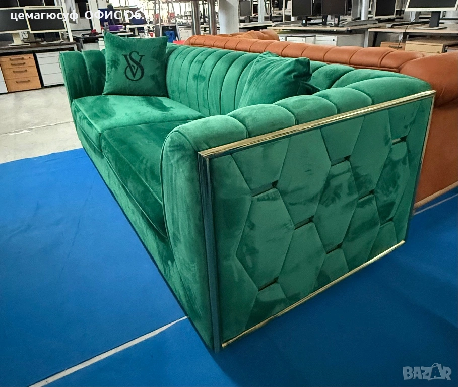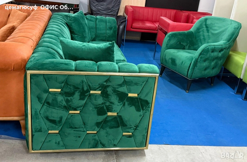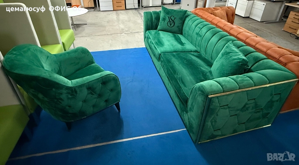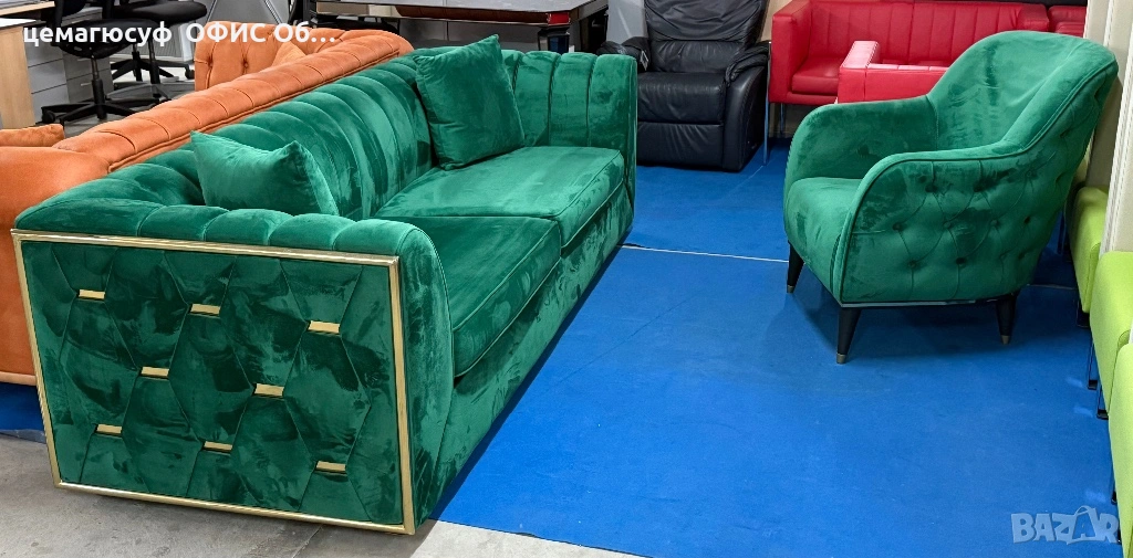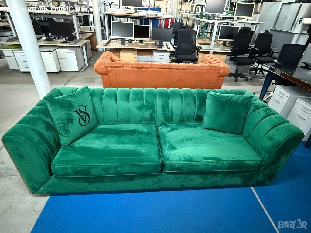 Италиански ликсозен и модерен диван триместен с фотьойл зелено кадифе