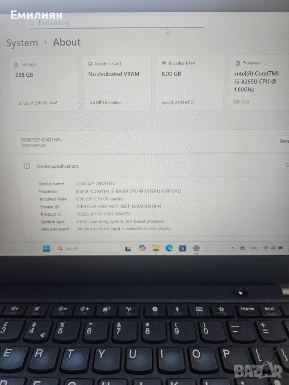Процесор: Intel Core i5-8265U (4 ядра, 8 нишки)