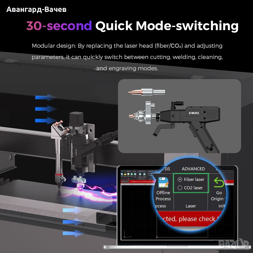CNC машина за лазерно рязане и машина за фибролазерно заваряване М3 УЛТРА 13 999,00 щ.д. 3KW 1.5MPa инверторен винтов въздушен компресор 3KW 1.5MPa 3 800,00 щ.д. Комплект защитни лещи за фибърен лазер за серия M2/M3 (10 бр.)79,00 щ.д. Универсален ротационен Gweike серия M799,00 щ.д. Комплект дюзи за лазерно рязане за серия M2/M3 (5 бр.) Еднослоен / 1,2 мм 49,00 щ.д. Комплект дюзи за лазерно заваряване за серия M2/M3 (5 бр.) AS-12 49,00 щ.д. Комплект въздушни филтри gweike cloud549,00 щ.д. Преносим фибърен лазерен гравер GWEIKE G2 20W/30W/50W G2 20W (110 мм/ръчно повдигане) самостоятелен 1 259,00 щ.д. Gweike G3 60W/30W MOPA оптичен и 40W диоден двоен лазерен гравьор G3 Pro - 30W MOPA оптичен лазер и 40W диоден лазер 4 299,00 щ.д. G6/G6 MOPA 30W/50W/60W/70W/100W фибърен лазерен гравьор G6 30W MOPA (6.9” x 6.9”) Ръчно повдигане 4 099,00 щ.д. G7 UV универсална лазерна маркираща и гравираща машина 5W/10W/15W 5W (4,3''x4,3'') Ръчен асансьор 3 899,00 щ.д. Gweike 5kw Еднофазен напълно автоматичен регулатор на променливотоково напрежение399,00 щ.д. Рязане, заваряване, гравиране и още – специални оферти вътре Фибърен лазер Заварчик CNC лазерен резец + Фибърен лазерен заварчик 6-в-1 (CNC лазерен резец + фибърен лазер Заварчик + CO₂ лазерен резач/гравьор) Модел Лазерна мощност Цена преди продажба М800 800W фибърен лазер 3 899 долара 4 899 долара М1200 1200W фибърен лазер 4 899 долара 5 499 долара Един лазер, безкрайни възможности - Оптимизирайте металообработката си от прототипиране до финализиране Присъединете се към над 10 000 производители по целия свят! Вижте какво правят другите, как го правят и как можете да подобрите работата си с лазер. Присъединете се към нашата Facebook група Вземете купон от $800 и шанс да закупите лазерен заваръчен апарат M1200! Започнете със заваръчен модул, надстройте до пълноценен CNC фибролазер СТЪПКА 1: Присъединете се към нашата Facebook група Участвайте в томболата за лазерен заваръчен апарат M1200. Ще обявим часа на тегленето и победителите директно в групата. Присъединете се сега СТЪПКА 2: Регистрирайте имейла си Вземете купон на стойност 800 долара след регистрация. задължително за тегленето — не пропускайте! Въведете имейл адреса си Традиционните фибърни лазери са били скъпи и обемисти, което е ограничавало обхвата им до дома и малкия бизнес сега. Gweike M Series 6-в-1 предефинира достъпността, съчетавайки 1200W фибърен лазер за прецизно рязане и заваряване на метал със 130W и 80W CO₂ лазери за сложно гравиране и рязане на неметални материали. Чрез елиминиране на нуждата от множество машини, намаляване на разходите с 5 пъти по-бързо заваряване и осигуряване на изключително остра като бръснач прецизност от 0,02 мм, високопроизводителната лазерна обработка е по-достъпна от всякога. 800W/1200W фибърен лазер Рязане/Заваряване/Почистване 80W/130W CO₂ лазер Рязане/Гравиране Защо серията M на GWEIKE е най-добрият избор? Gweike има над 20 години опит в научноизследователската и развойна дейност и производството на мащабно лазерно промишлено оборудване. Сега грандиозно представяме оборудването от серия M, което ще внесе индустриално оборудване във вашия дом и студио. Това не е просто устройство „Направи си сам“. То интегрира индустриален лазер, за да улесни обработката ви. Една машина, 6 метода на обработка Намалена цена от 70% CNC портално рязане Лазерно заваряване Лазерно почистване Ръчно рязане CO₂ лазерно рязане CO₂ лазерно гравиране Какво можете да постигнете със серията Gweike M? Освободете безкрайната си креативност - 30-секундно бързо превключв