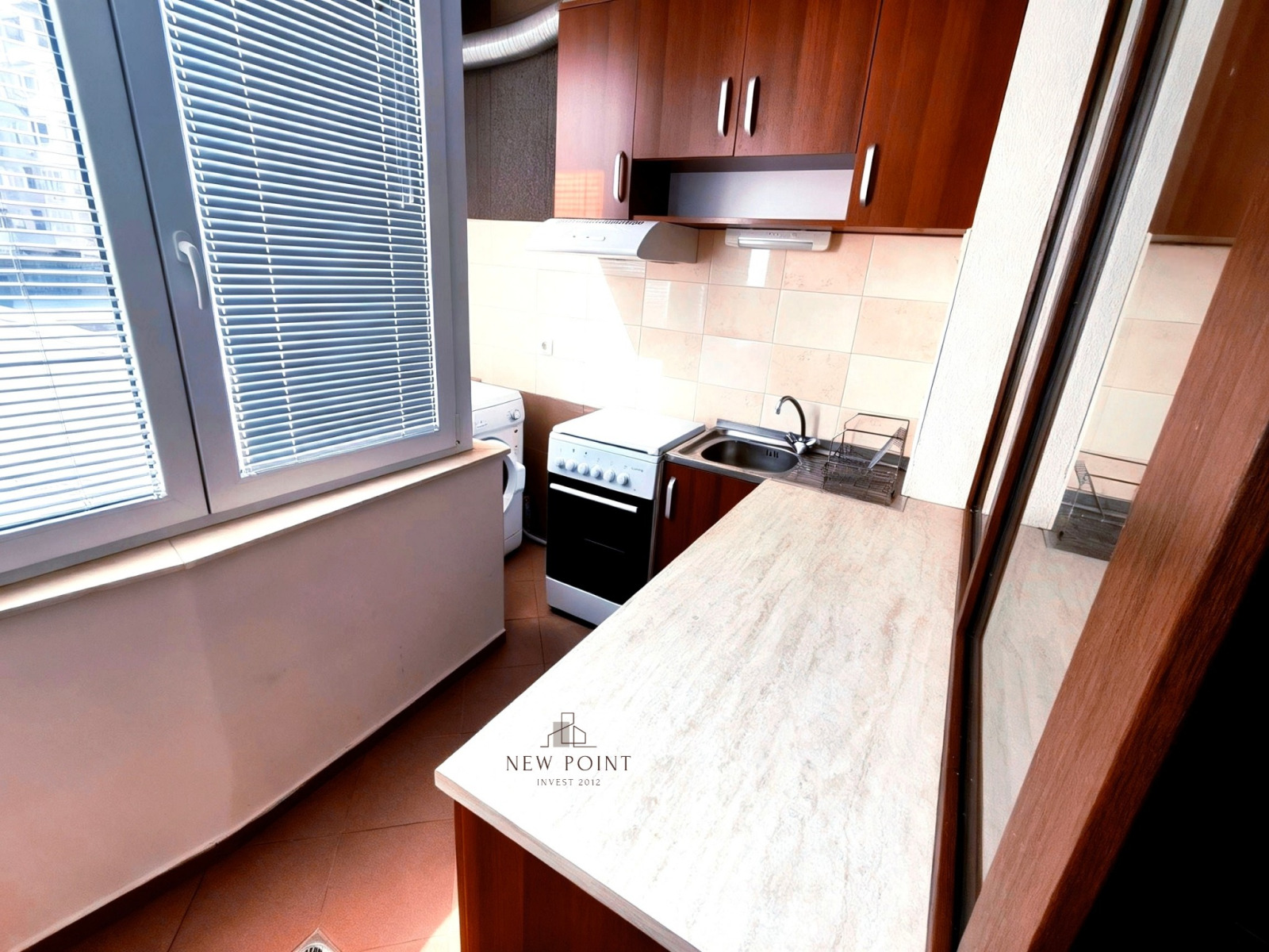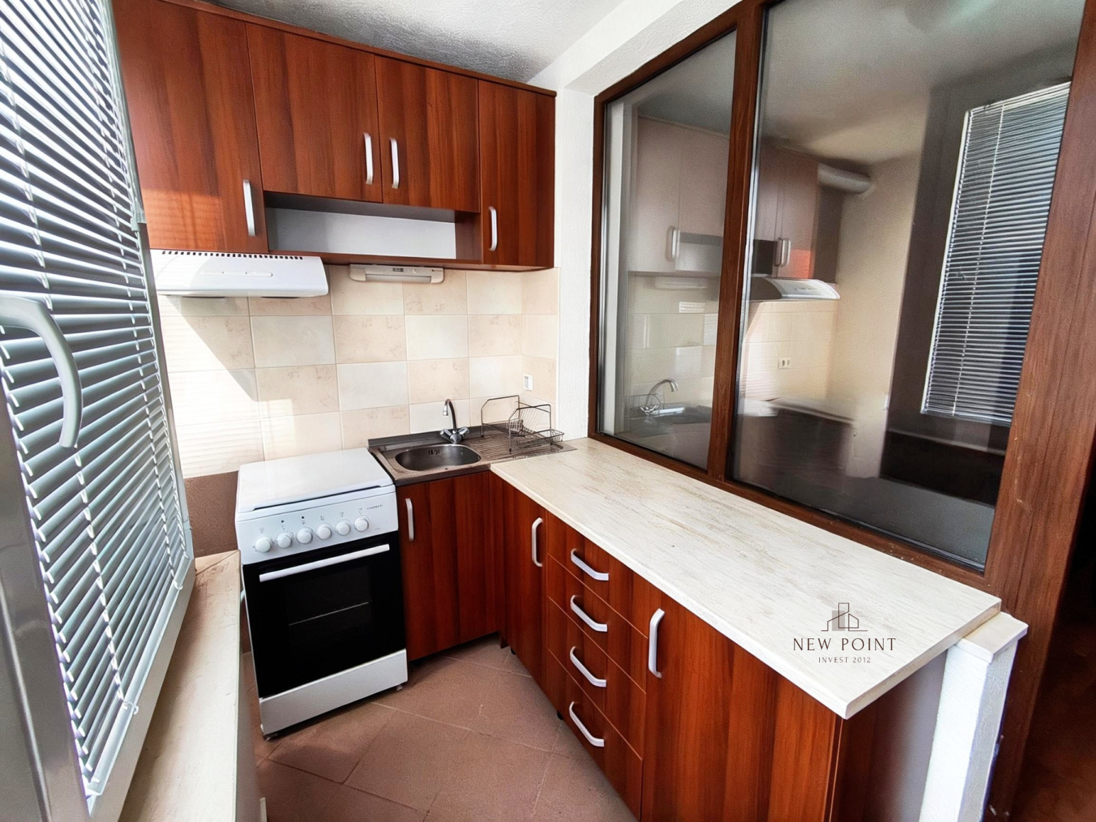 Имотът разполага с практично разпределение, включващо входно антре, светъл хол с усвоен балкон, обособен като кухненска част, уютна спалня с излаз към втори балкон и баня с тоалетна.