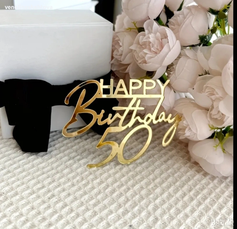 Happy birthday 50 Честит рожден ден златист акрилен топер за торта → Обява 53343857