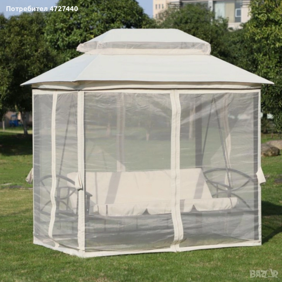 Луксозна градинска шатра с люлка и функция сън за пълен релакс Размери в позиция за сядане: Дължина 180 см x Ширина 50 см x Височина 49 см. Размери в легнала позиция: Дължина 180 см x Височина 104 см. Външни размери на шатрата: Дължина 245 см x Ширина 165 см x Височина 243 см; височина на прохода 185 см. Материали: Стоманена рамка, водоустойчив полиестерен покрив, дишаща мрежа против насекоми, меки подплатени възглавници. Капацитет: До 3 души комфортно; мек пълнеж на възглавниците (5 см). Монтаж: Лесен и бърз монтаж с включени крепежни елементи.